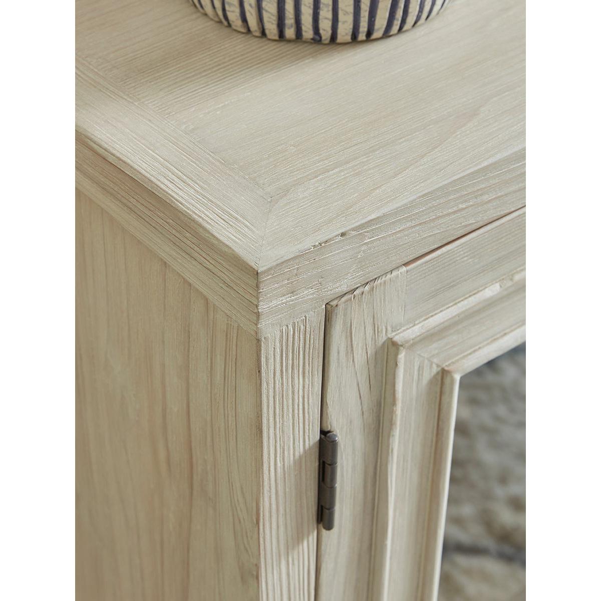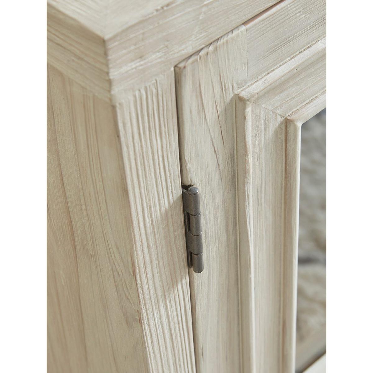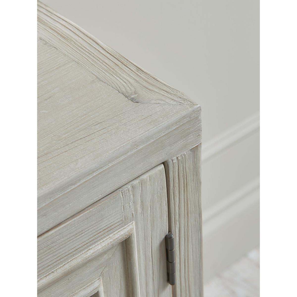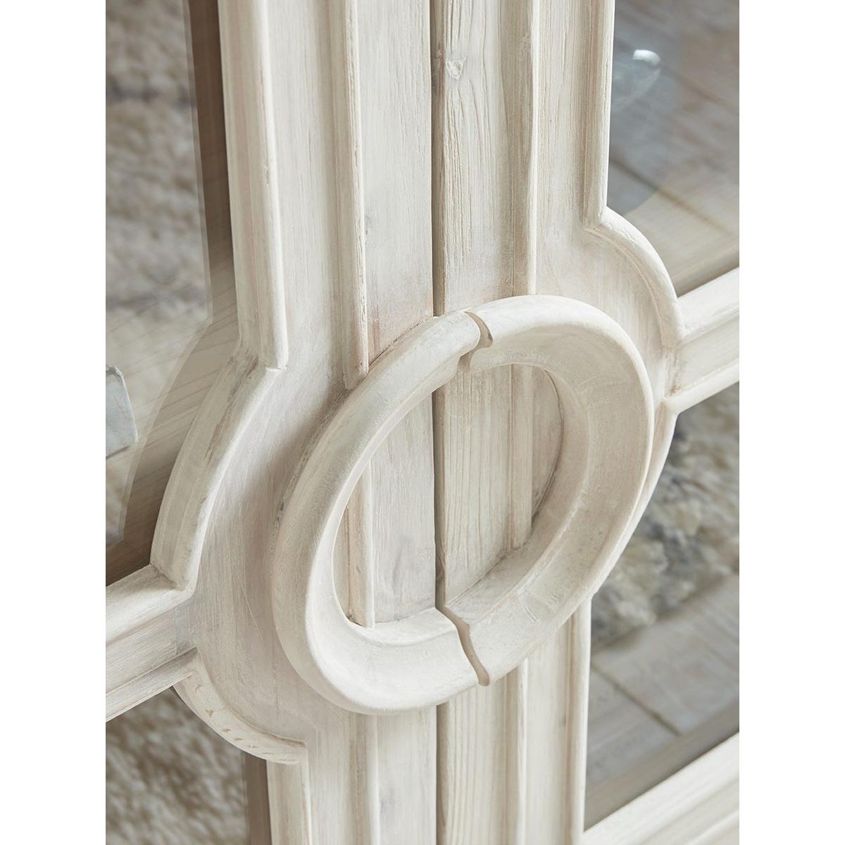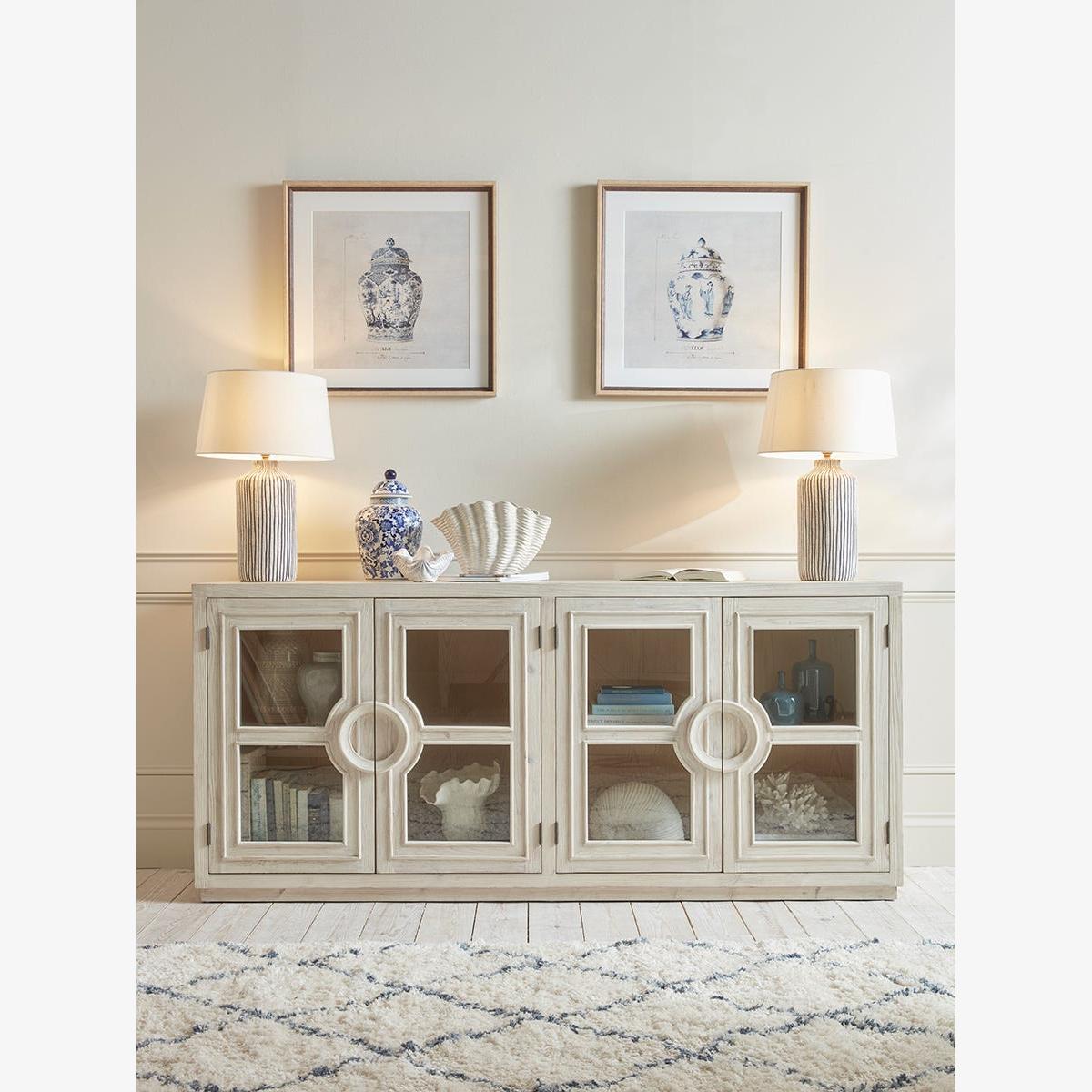 Feature round moulded door handles draw the eye to this elegant sideboard. Crafted from recycled pine, the wood has an almost bleached tone which softens its formality and gives a fresh country feel. Glazed doors create a sense of lightness and allow you to display favourite collections of books or china and adjustable shelves make it a versatile piece for living or dining room.