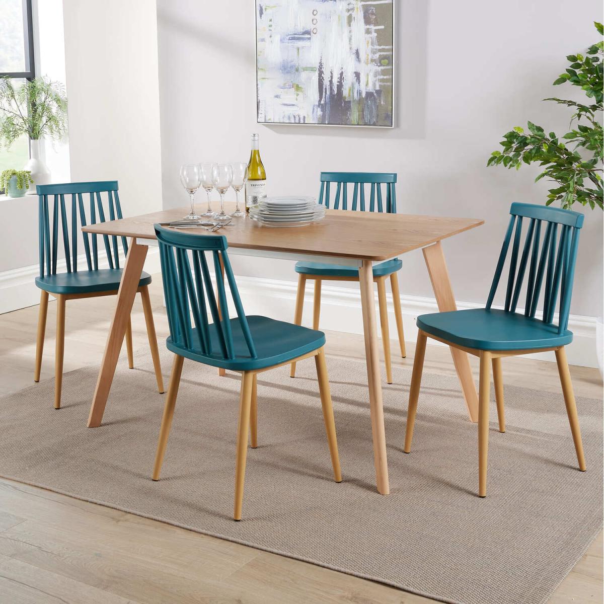 This rectangular shaped dining set with 4 chairs is a perfect addition to any home. Made from quality ash veneer with solid beech legs, you can be sure that this table is crafted with quality in mind. The sleek edge design means that the table can be placed up against a wall or central in a space. The Lucy chairs are ideal when paired with this Rayna dining table and offer a contemporary living vibe. With its modern range of finishes, slatted back and stylish tapered legs, this Scandi-inspired design brings a sleek look to your home. With a powder coating metal base and quality iron tube legs, you can be sure that this chair is a good choice. Assembly is required to help keep the cost low. Table Size (W) 120cm (D) 80cm (H) 73cm. Chair Size (W) 46cm (D) 43cm (H) 84cm