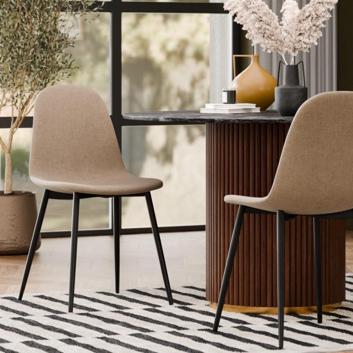 I’m a big fan of the Rayner chair in latte fabric for its clean lines, muted tone and slim black legs - it quietly elevates everything from a Scandi-inspired kitchen to a pared-back industrial dining space. The sustainable upholstery feels soft under your fingertips but is hard-wearing enough for daily use. To style, team it with a light oak or marble table and layer in natural textures - think a woven jute runner or linen napkins - to keep the look fresh. For extra comfort, add a simple boucle cushion in cream or ochre, and group them in odd numbers for a relaxed, balanced feel.