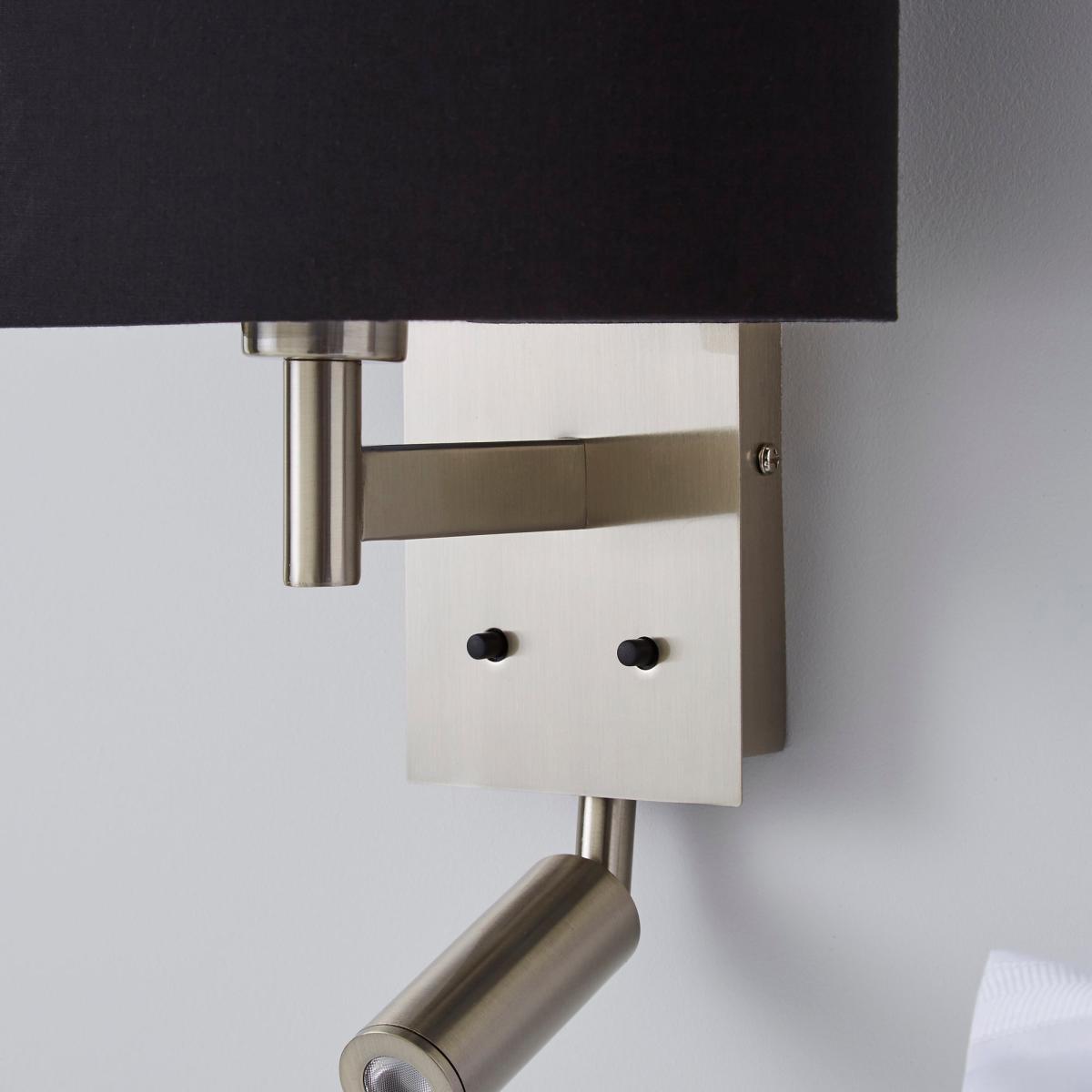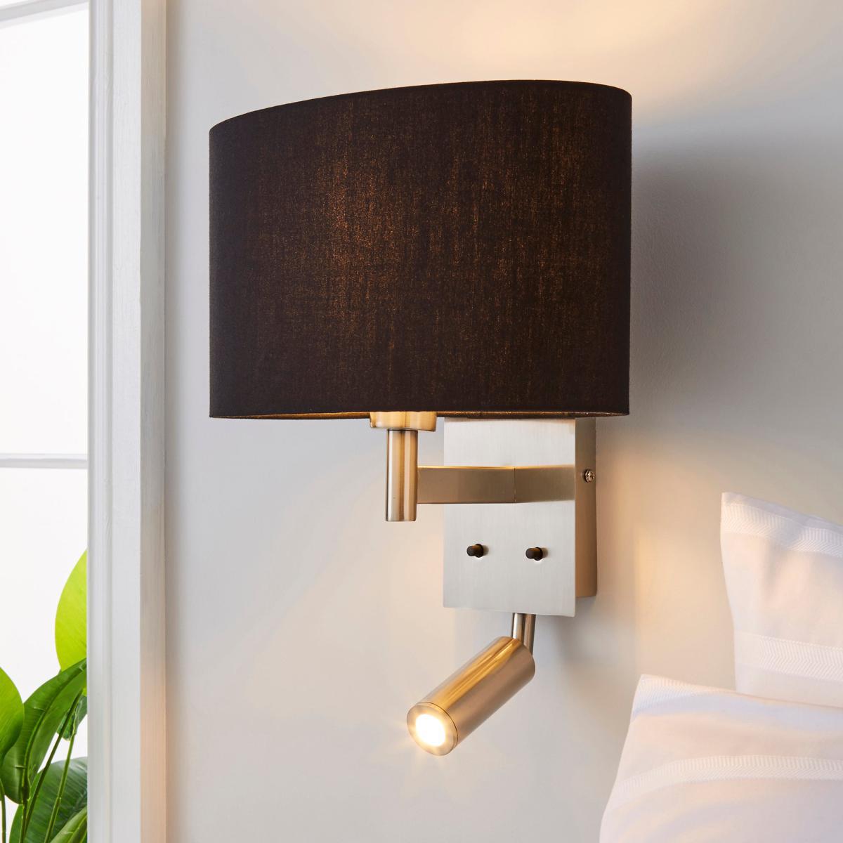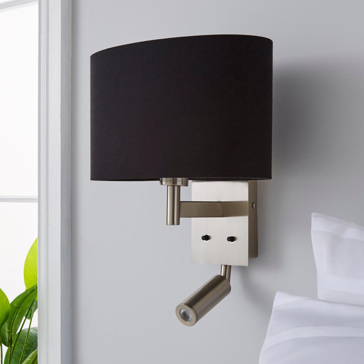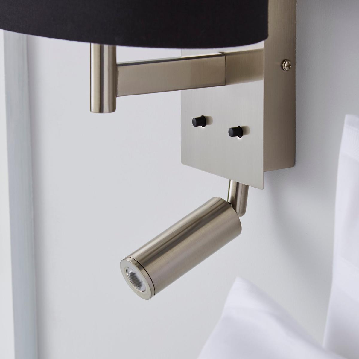 The Reader Wall Light in Black features a vintage shade and a stunning Satin Nickle finish. With a Push switch included and a beautiful Steel & Fabric construction this is perfect for any home. The small reader light has an integrated LED with 2700 Kelvins and 160 Lumens. Click. Here. To purchase the recommended bulb. This light comes with a 2 year guarantee. Click. Here. To view our Terms & Conditions.