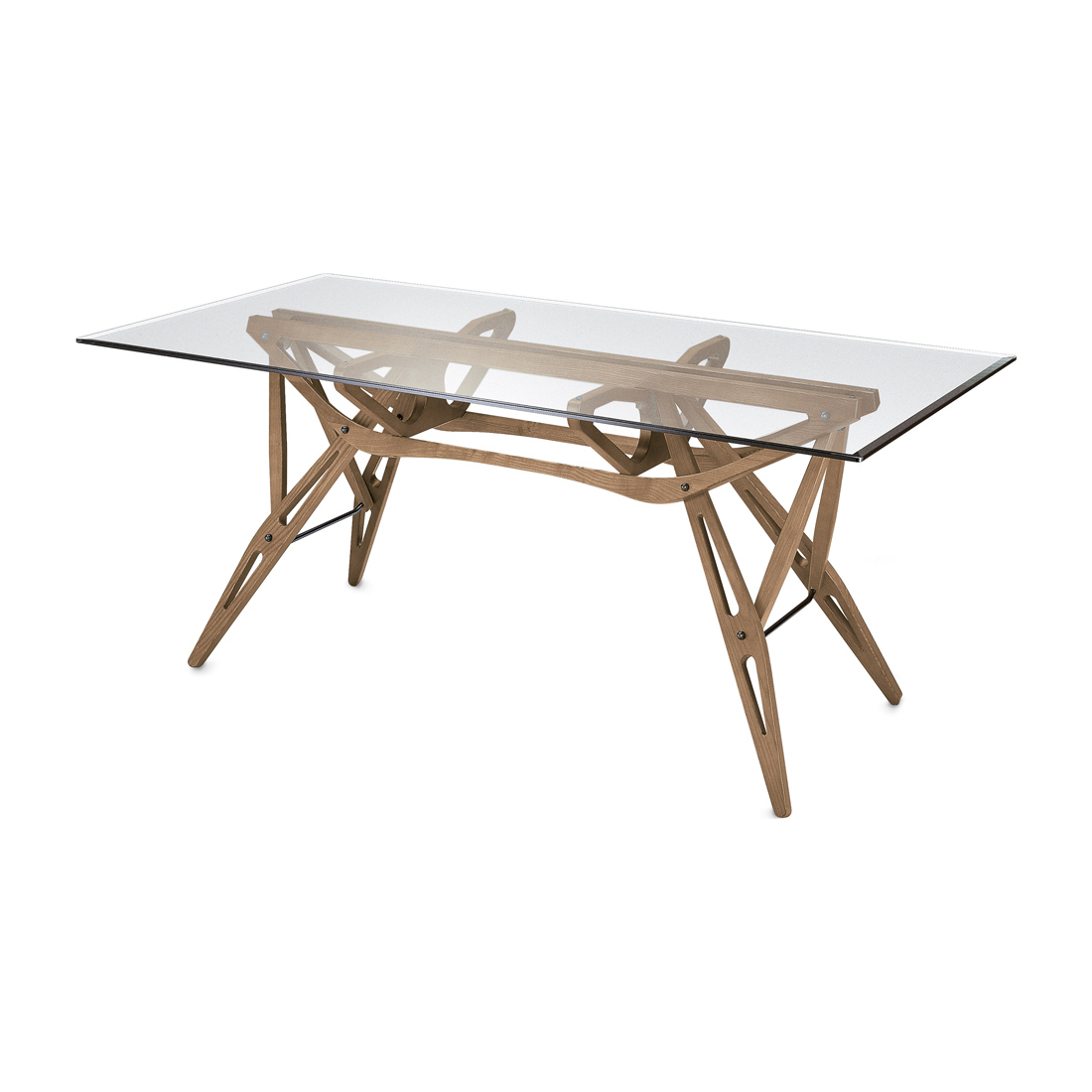 Designed by Carlo Mollino, this Reale table in a Canaletto walnut dyed oak finish with a glass top is a timeless design that fits seamlessly into a contemporary landscape. The Reale table was originally conceptualised in 1946 and remains an emblem of the designer’s aptitude for achieving function using an eccentric, complex silhouette. Reissued by Zanotta, Reale is a juxtaposition of honest materials, with a five inch bevelled glass top resting on slender lines of Canaletto walnut dyed oak, all held together by a series of intricate joints in strong, perfectly-balanced suspension. This timeless twentieth-century design is starkly contemporary and demonstrates Mollino’s undeniable foresight into the future of design.