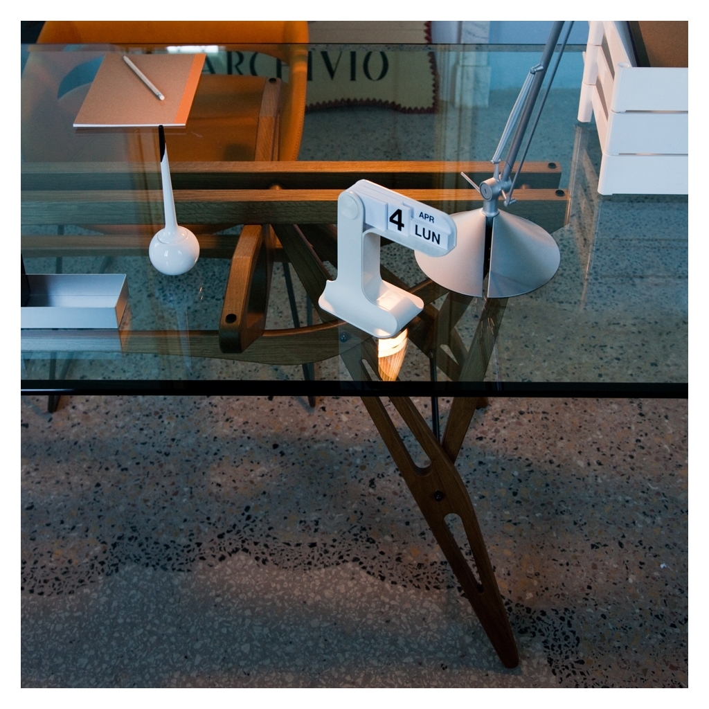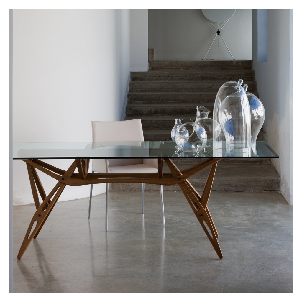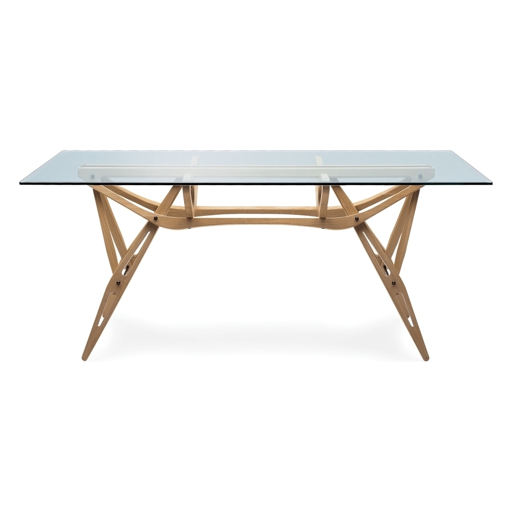 Designed by Carlo Mollino, this Reale table in a natural dyed oak finish with a glass top is a timeless design that fits seamlessly into a contemporary landscape. The Reale table was originally conceptualised in 1946 and remains an emblem of the designer's aptitude for achieving function using an eccentric, complex silhouette. Reissued by Zanotta, Reale is a juxtaposition of honest materials, with a five inch bevelled glass top resting on slender lines of natural dyed oak, all held together by a series of intricate joints in strong, perfectly-balanced suspension. This timeless twentieth-century design is starkly contemporary and demonstrates Mollino's undeniable foresight into the future of design.