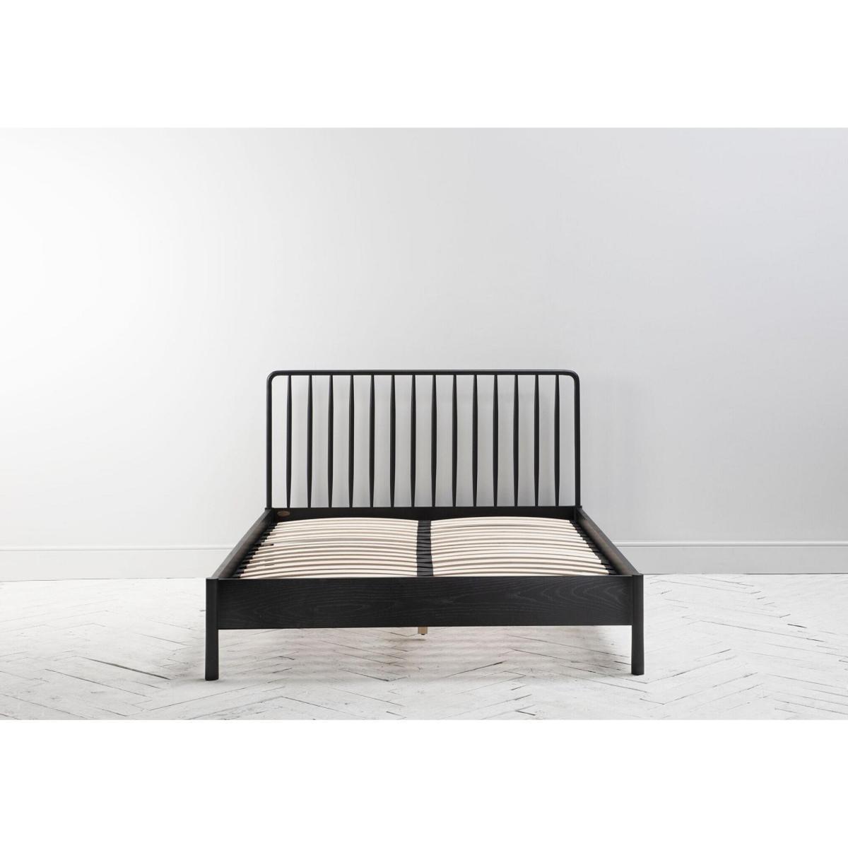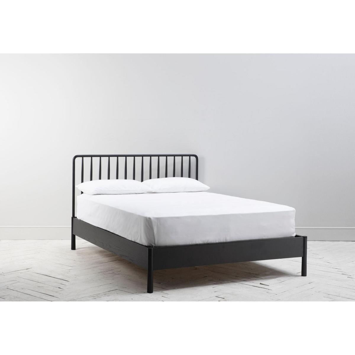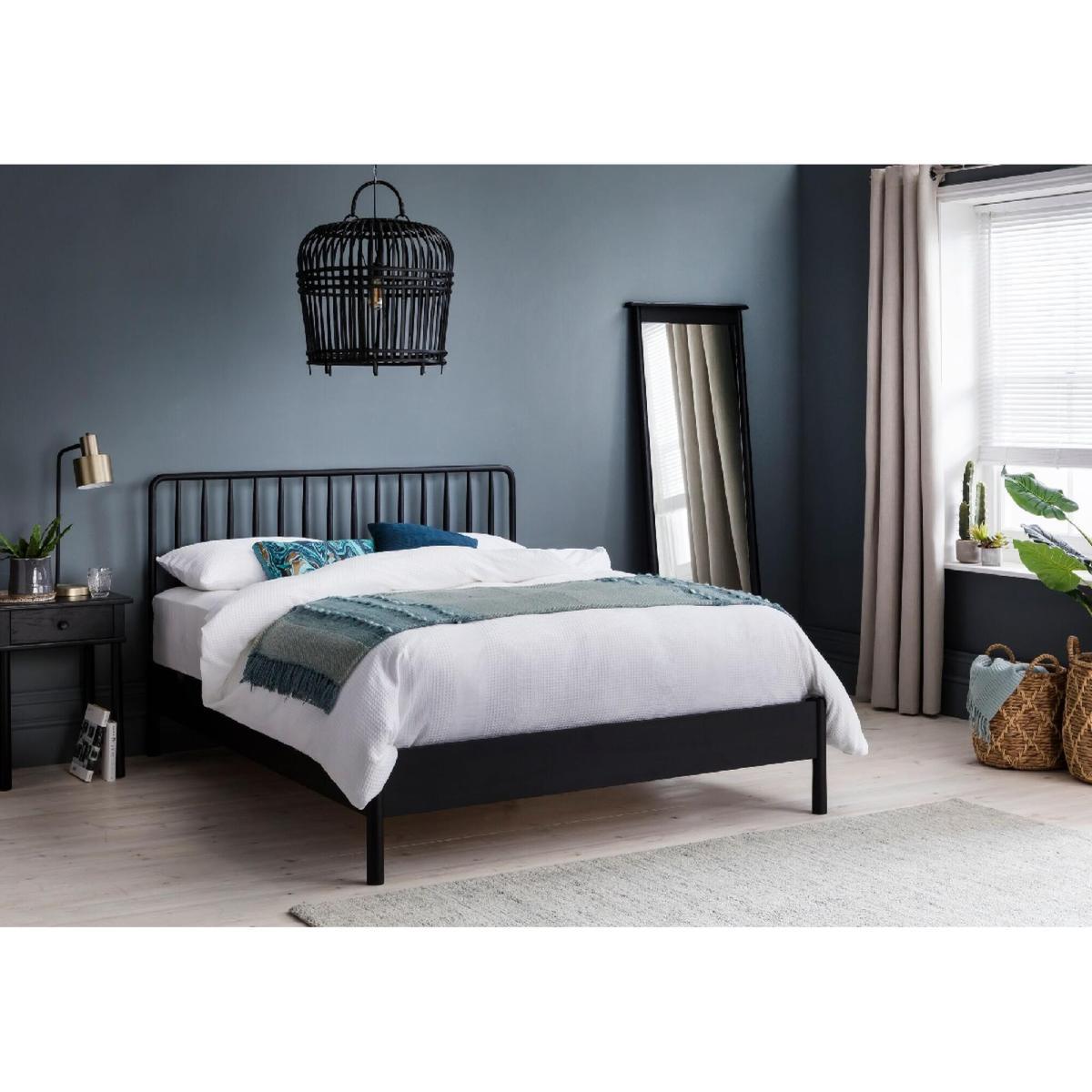 I’m a fan of this Rebecca bed frame for its slim, vertical slats and matte black oak finish - it feels both sturdy and streamlined. It suits minimalist, Scandinavian or industrial-inspired rooms, where its dark tone can anchor softer palettes or echo metal accents. For styling, keep bedding in natural linens or muted hues, then layer in a textured throw and a couple of tonal cushions. Pair with simple bedside stools or wire-frame tables and add a sculptural lamp to pick up on the frame’s lines. A large plant or framed monochrome print behind the headboard will complete the look without crowding the space.
