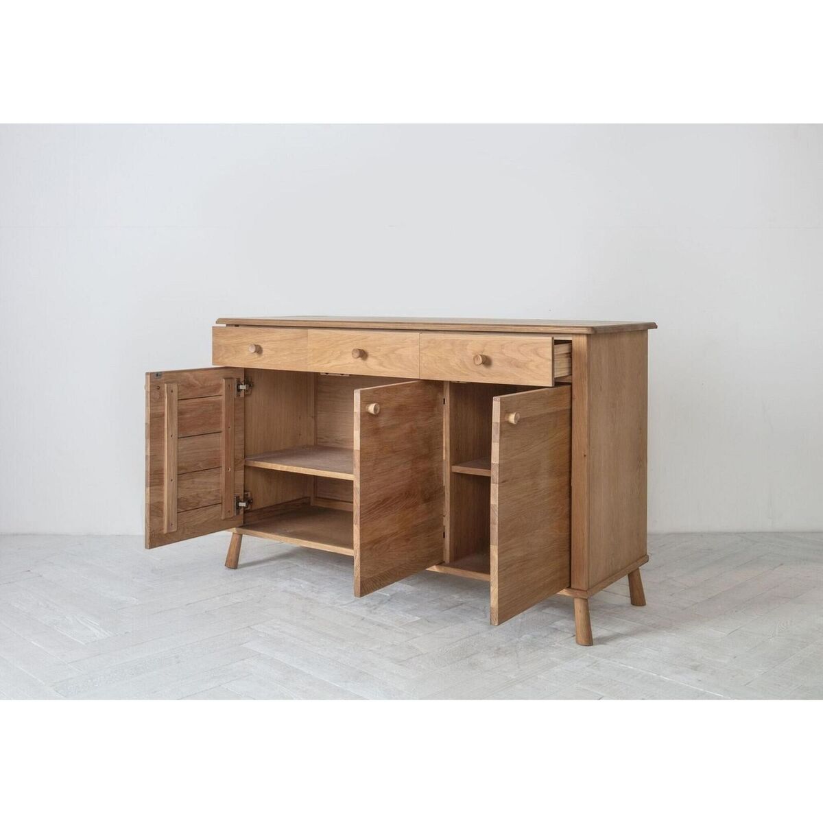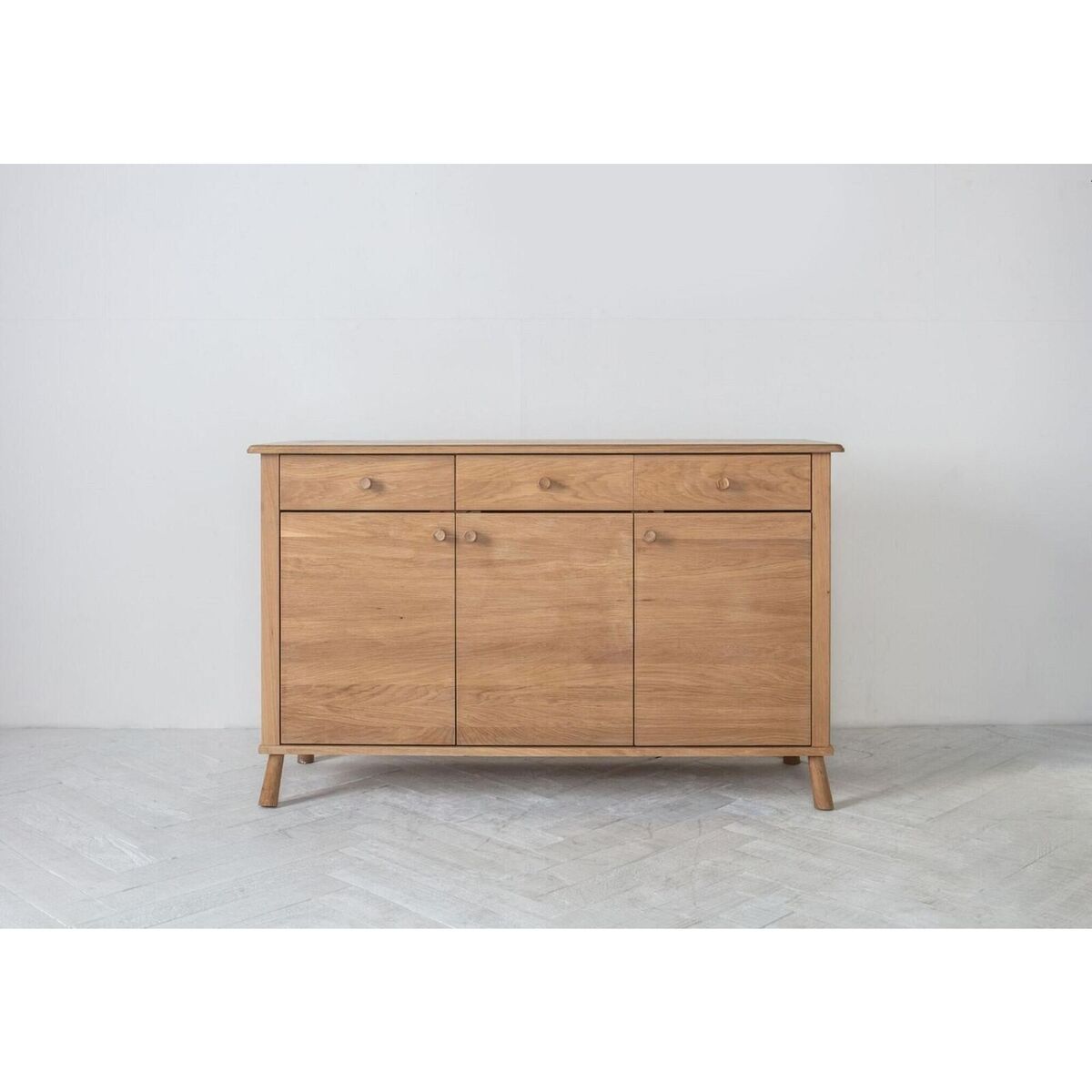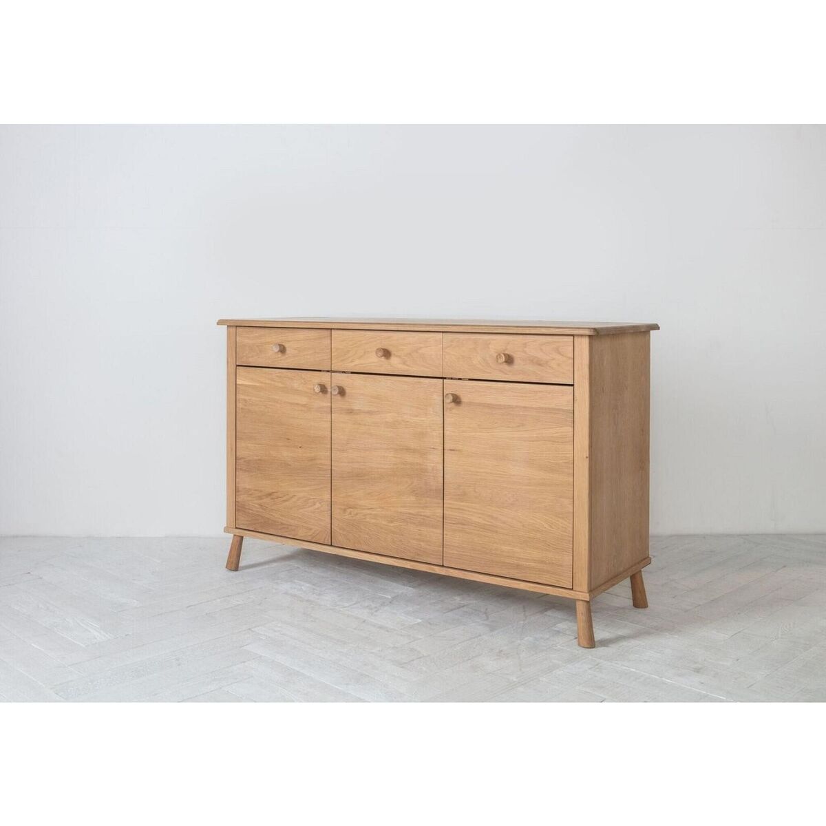 A beautiful piece of Scandi coolness, the Rebecca sideboard is the perfect way to declutter any room in the house. This minimalistic design, crafted from solid oak, draws a sophisticated line on modern storage, ticking off the functionality box while automatically styling up the room you place it in. The texture and prominent wood grain of the Rebecca stand out beautifully throughout drawer and cabinet fronts, tantalising your eyes to conceal the generous storage space - three drawers and cabinets with inner shelves - that lies inside. Decorate the Rebecca with colourful accents, such a vase of fresh flowers, a couple of decorative bowls or your favourite figurines to elevate its visual appeal and transform it into the focal point of your living room. Discover:. The Rebecca Range. Additional Information:. Material: Oak, Pine. Assembly Required. Storage: 3 Doors/3 Drawers. Internal Drawer Size: 353x335x66mm. Internal Cupboard Size: 1250x 553x 419 mm.