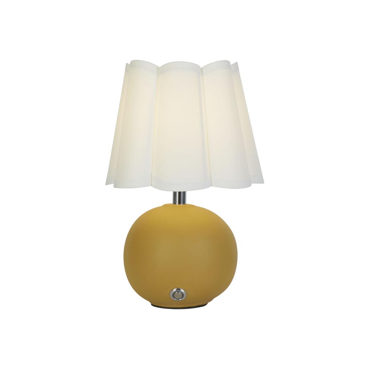 This compact table lamp blends playful design with practical functionality. Its spherical mustard base is paired with a soft white scalloped shade, casting a warm, inviting glow. Featuring a 3-stage touch dimmer and USB rechargeability, it offers modern convenience in a stylish, portable design.