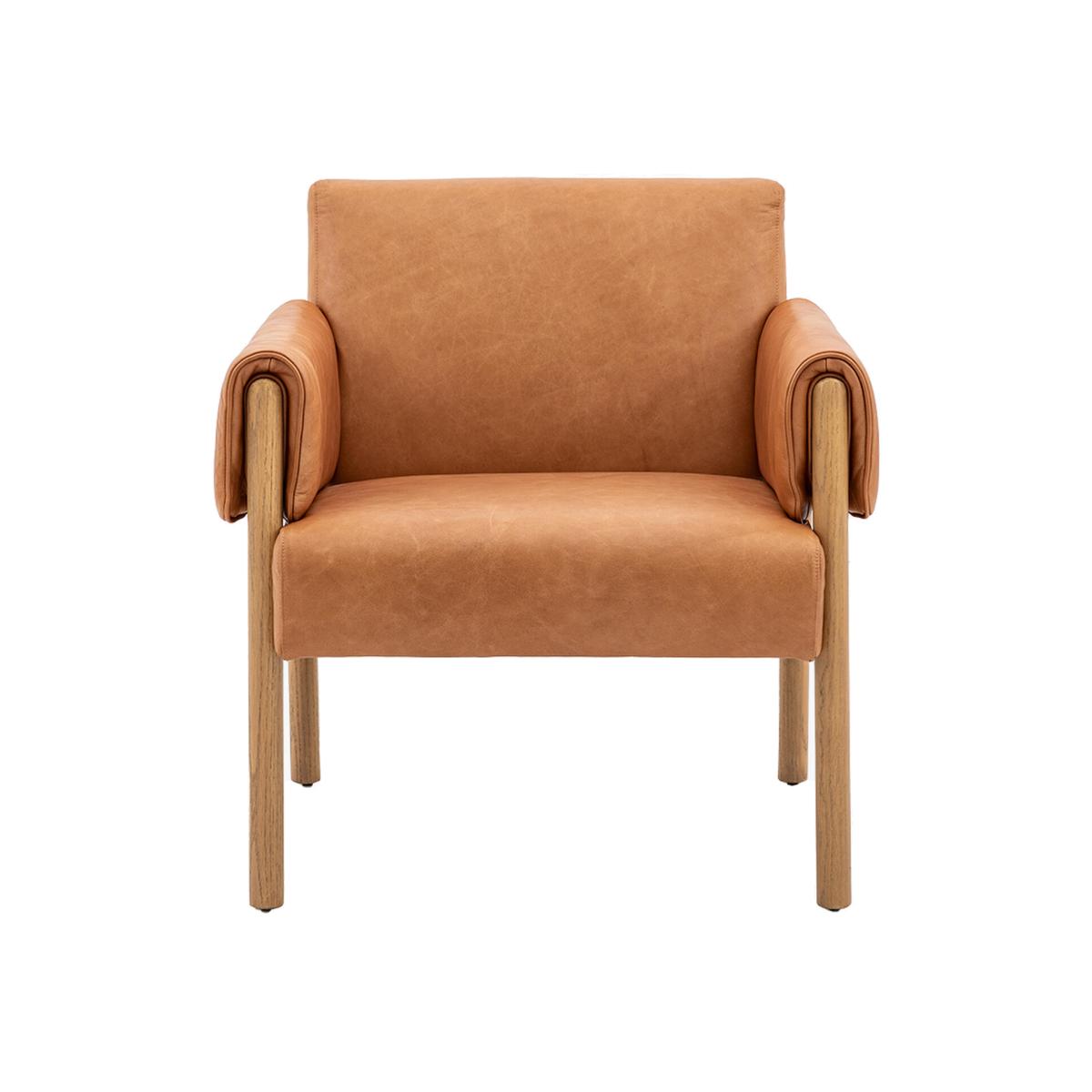 Sit back, relax and recharge. Crafted with the utmost care, this armchair has been upholstered in a brown leather for a timeless look which contrasts the thin wooden legs which adds a unique modern touch along with the leather-wrapped arms.
