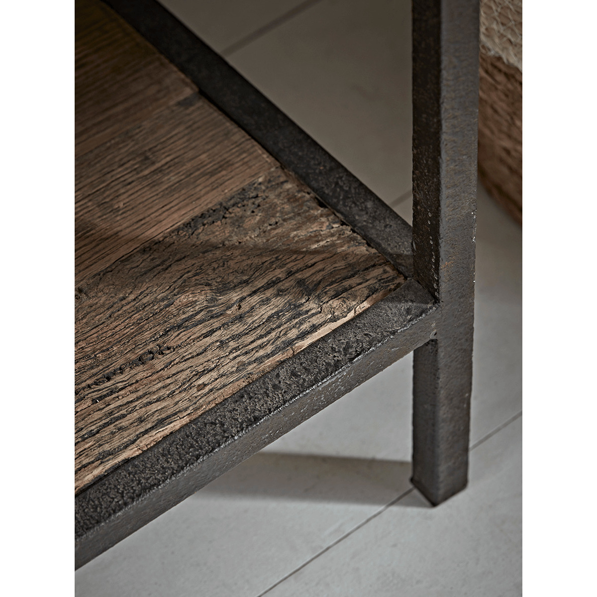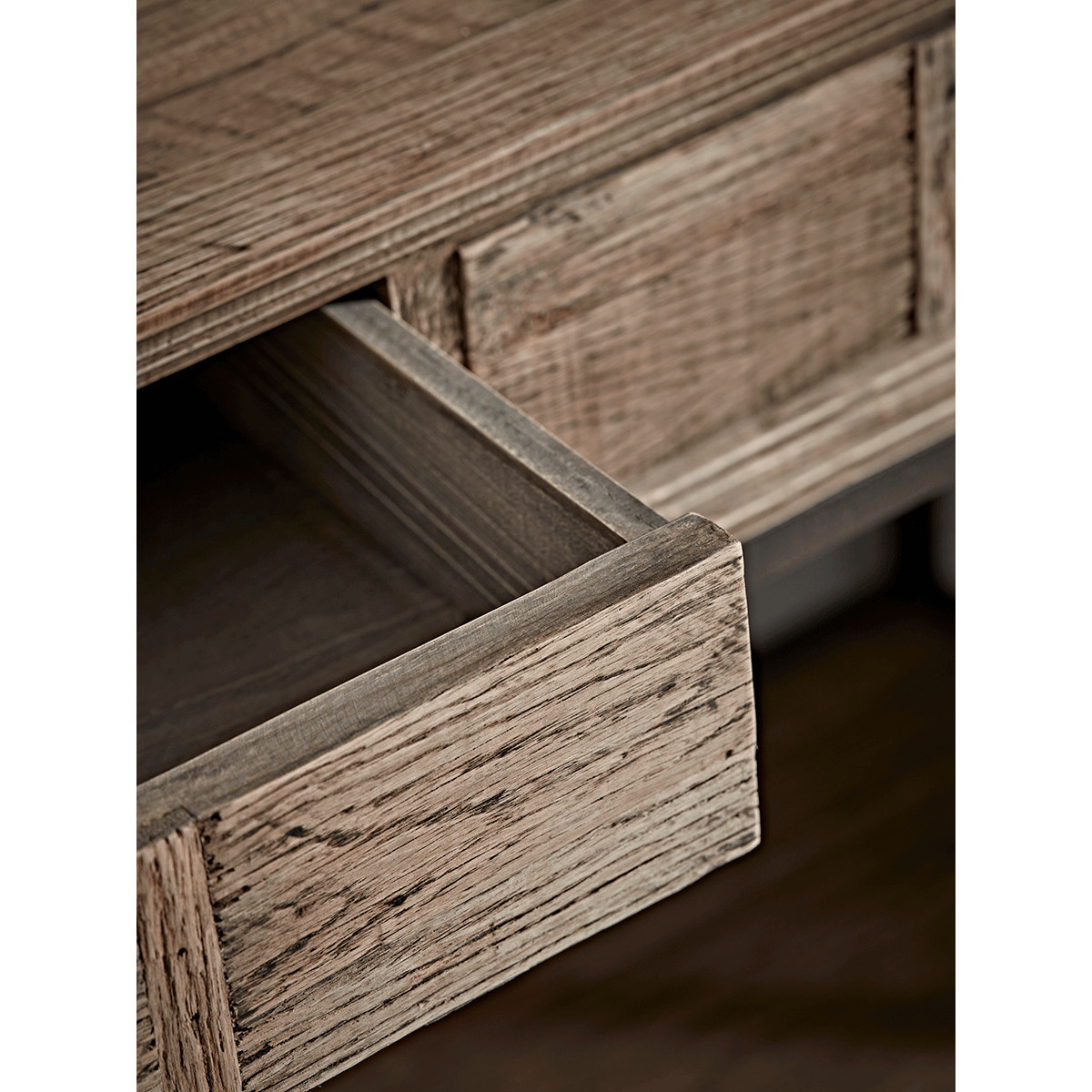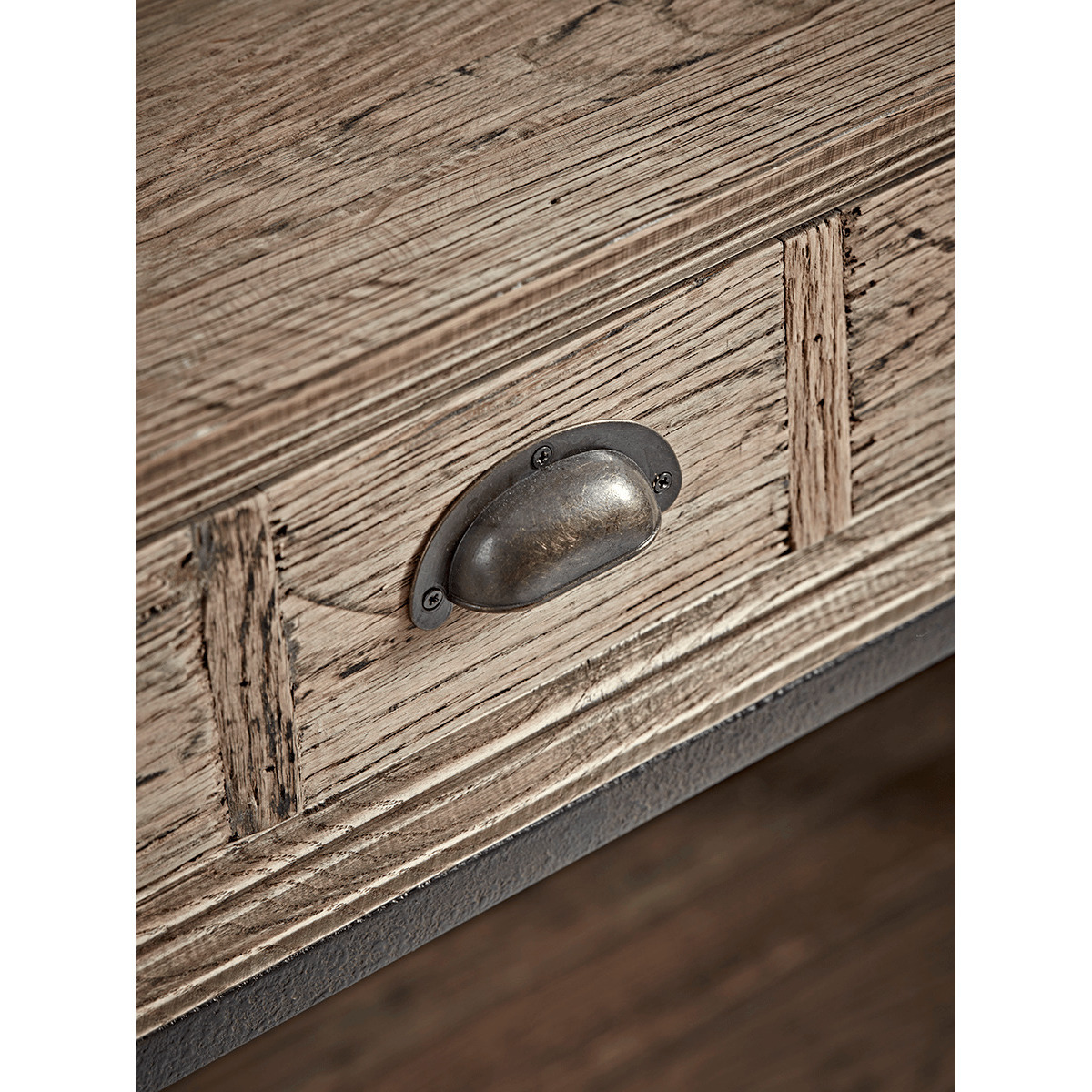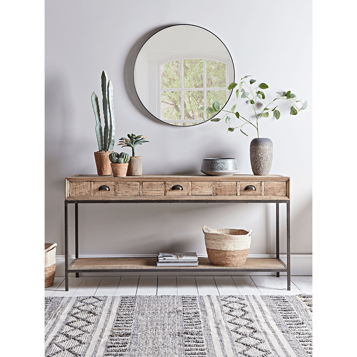 Large in size but perfectly slender and elegant, our reclaimed oak console table is a practical yet stylish accessory for your hallway or living space. It features an open shelf and three drawers with aged metal cup handles for ample storage space. Recreate the look with our Oversized Black Frame Mirror.