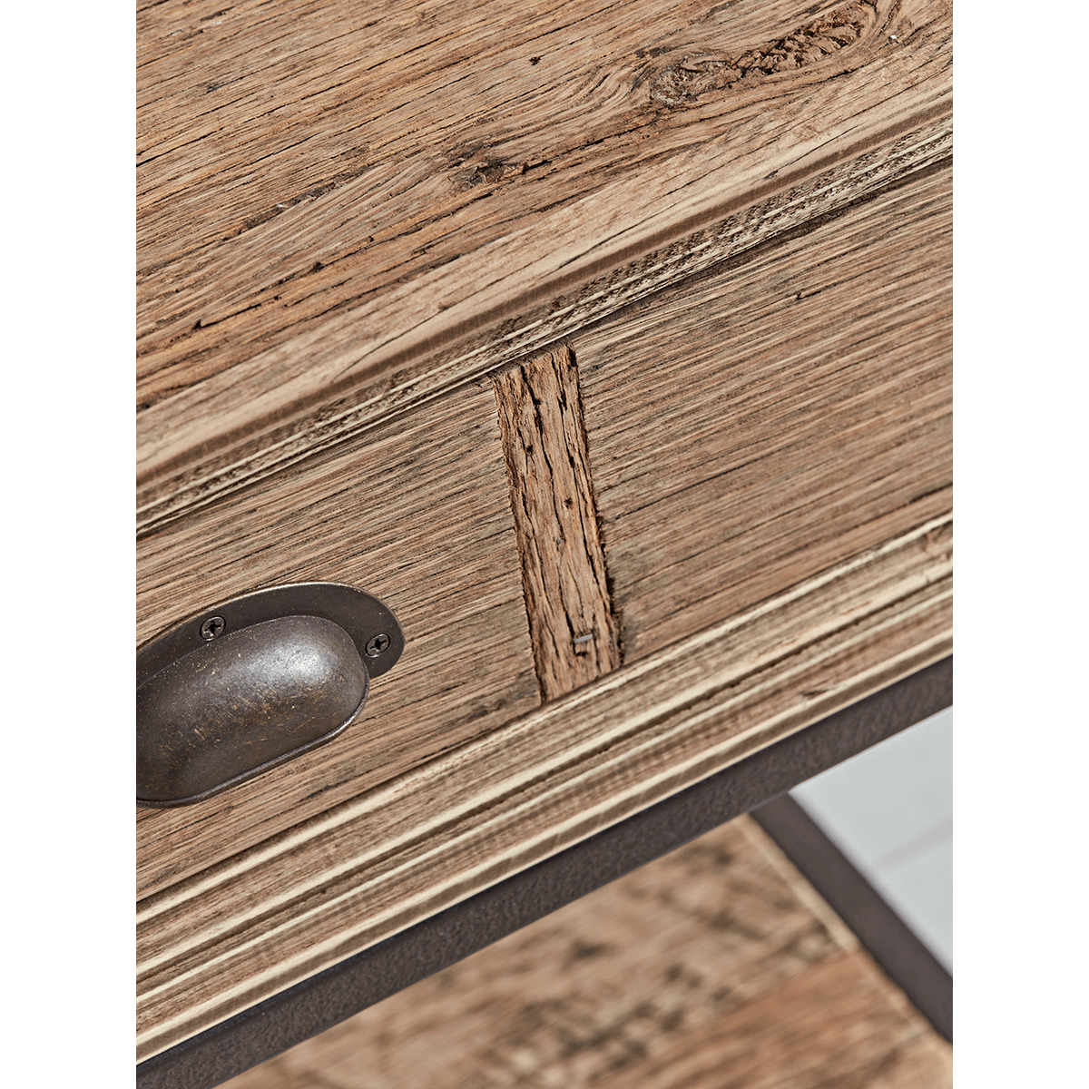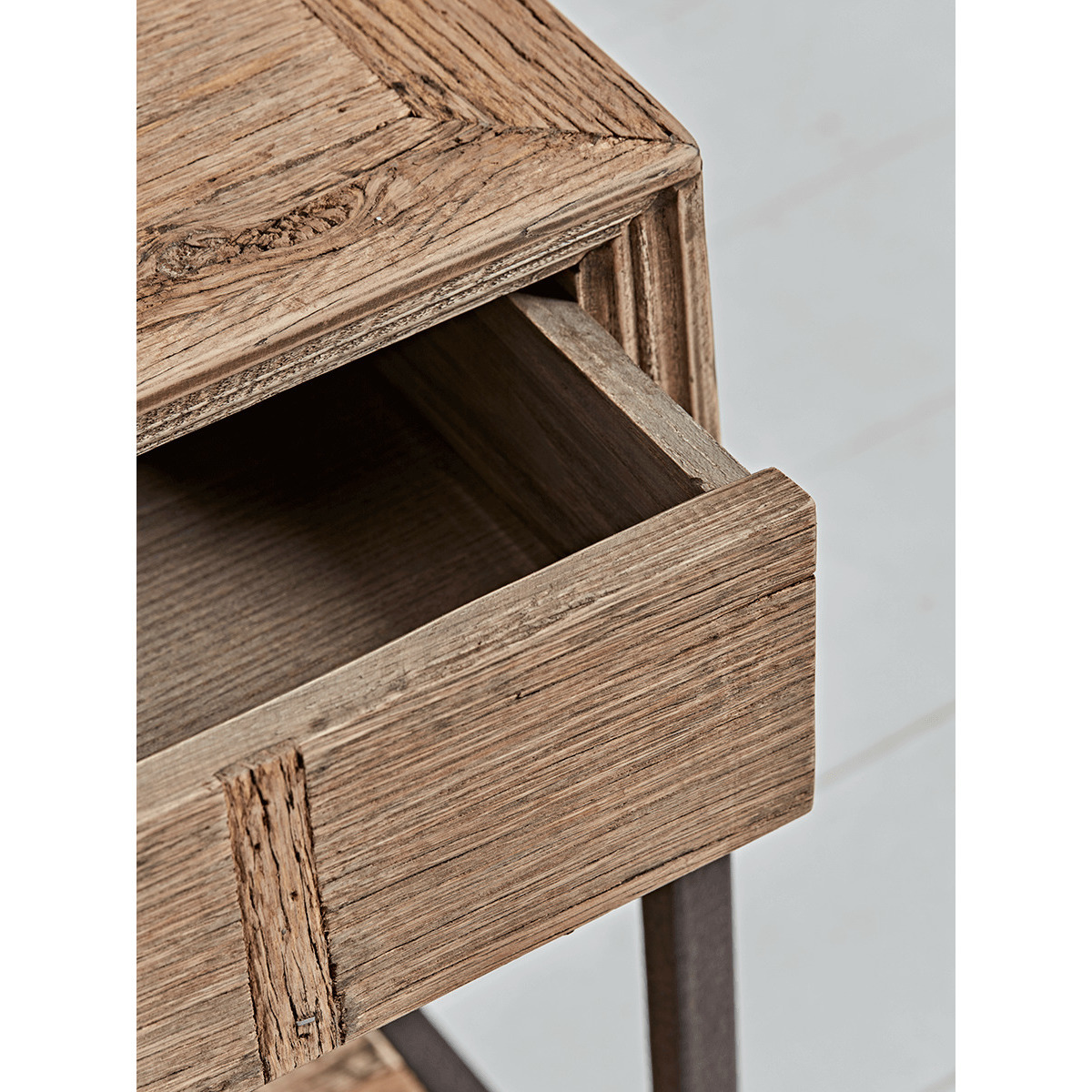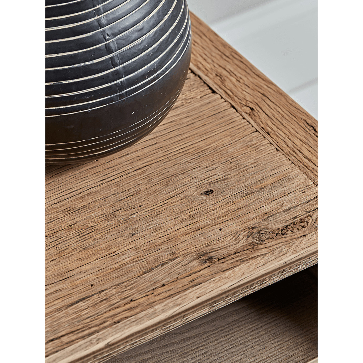 Crafted from reclaimed Oak, our sturdy side table has a smooth, unfinished top and visible wood grain details. With an open shelf and single drawer, its perfect for storing your essentials.