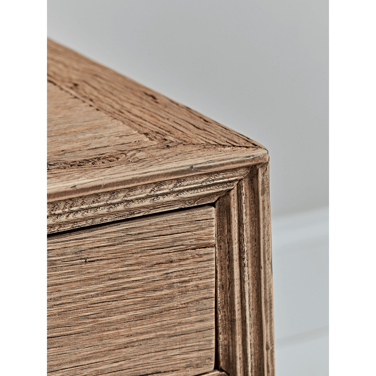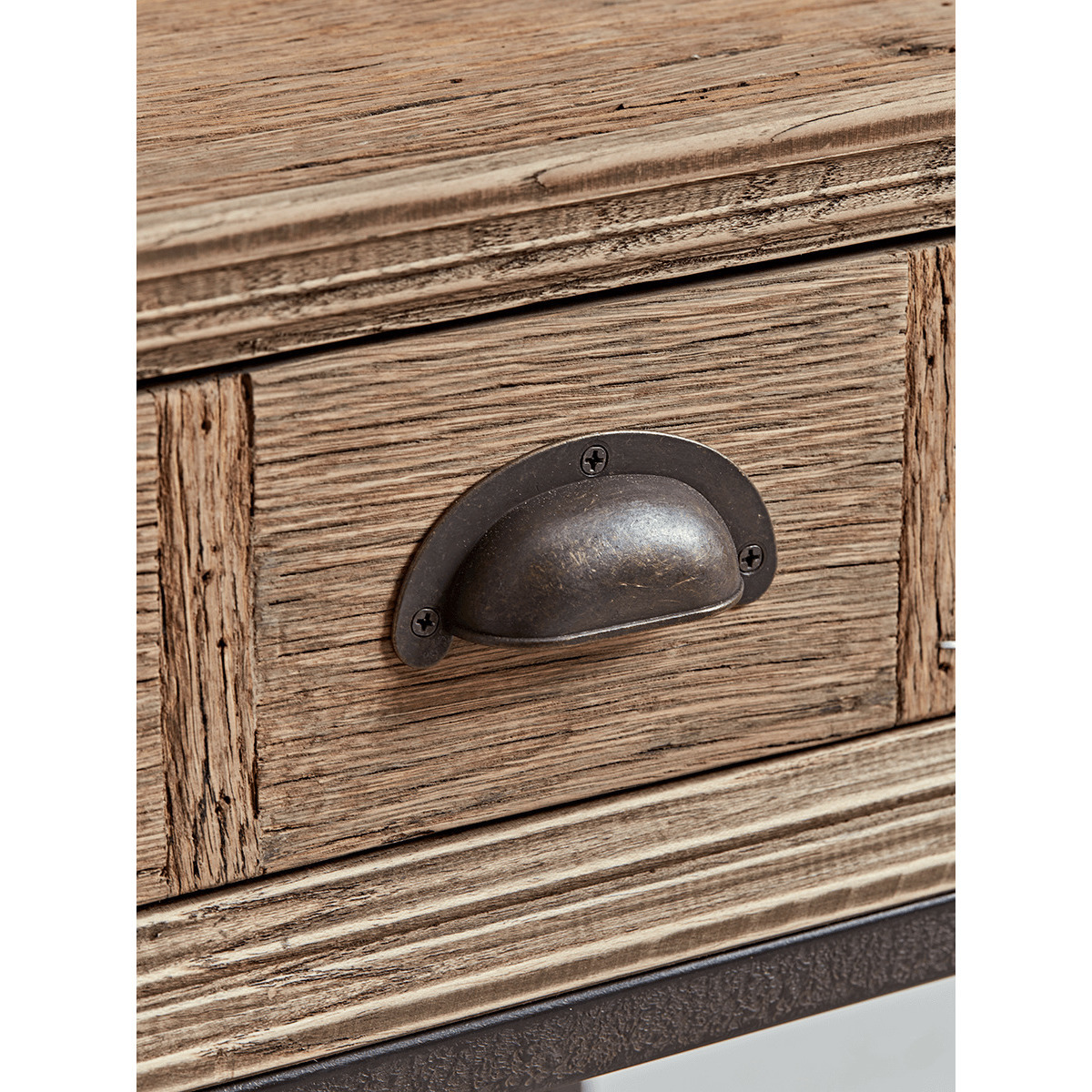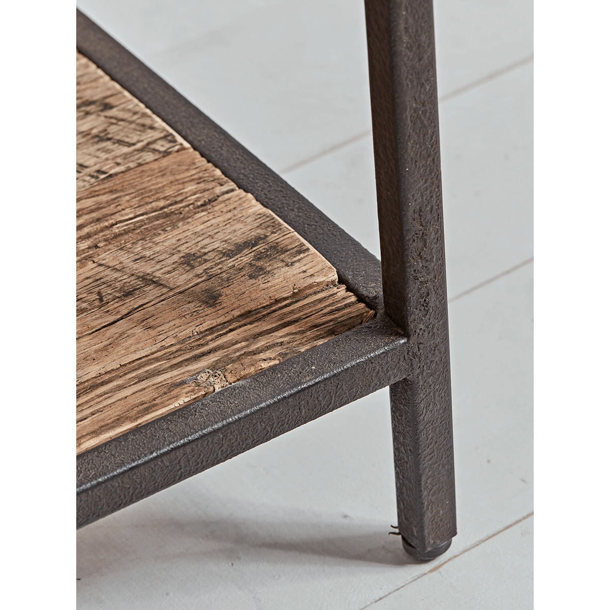 Crafted from reclaimed Oak, our sturdy side table has a smooth, unfinished top and visible wood grain details. With an open shelf and single drawer, its perfect for storing your essentials.