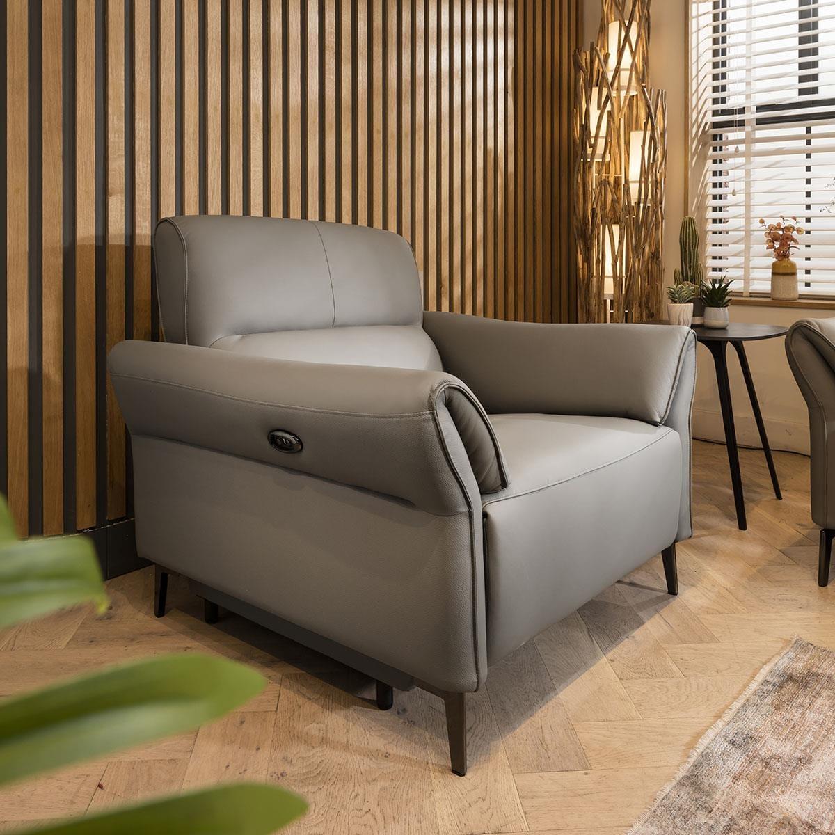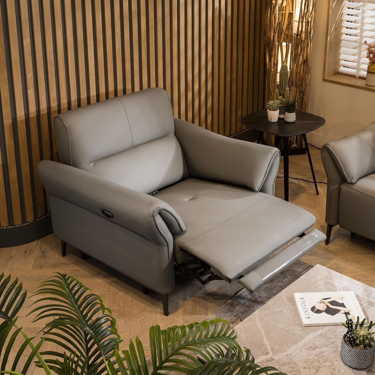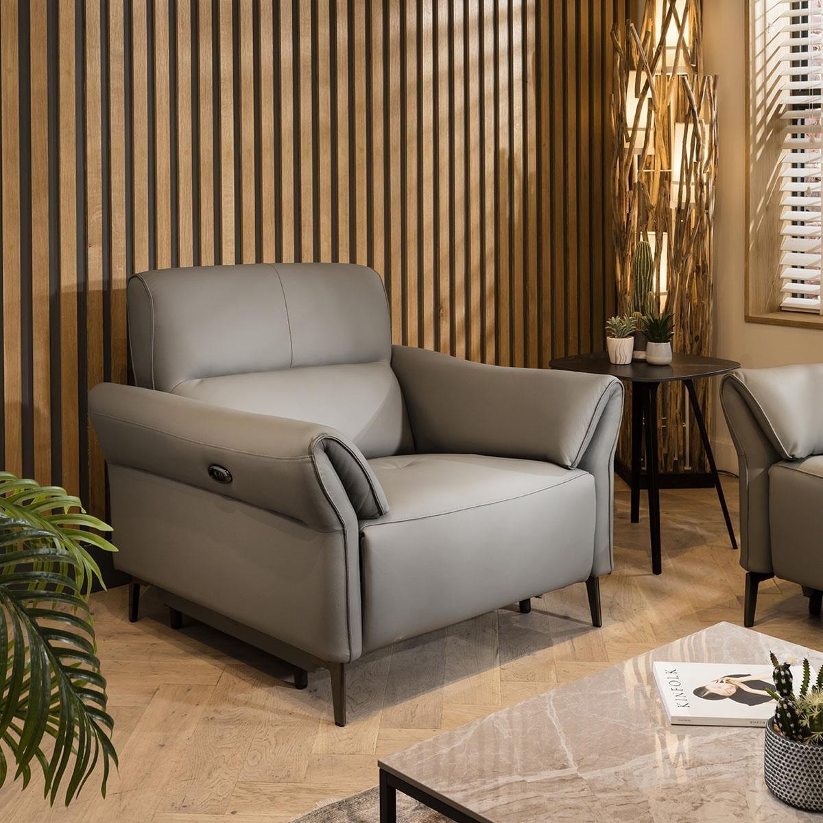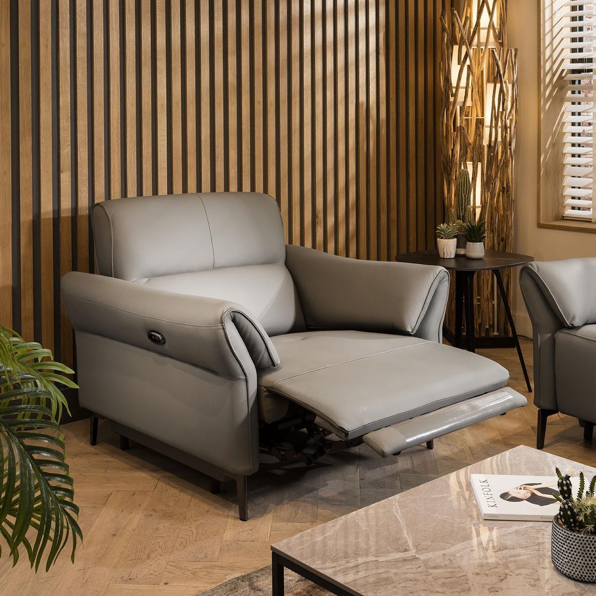 The ultimate chair for any modern living room: our premium leather rich grey recliner armchair. Our leather recliner arm chair boasts sleek and sophisticated design with rich grey leather & gunmetal legs. The electric recliner chair provides a luxuriously comfortable experience for anyone lucky enough to take a seat. Crafted with amazing build quality, this chair is designed to last. The high back design ensures maximum comfort and support, while the recliner controls on the side of the armchair make it easy to adjust to your desired position. The 3.5m power cable provides ample reach, giving you the flexibility to place the chair anywhere in your room. Made with premium genuine leather on the seat and arms, this recliner sofa exudes luxury and style. The back and outer-arms are made from high-quality faux leather, the material is easy to clean, durable, and gives a high-end finish to your living room. The electric-powered recliner adds a touch of sophistication to your space, allowing you to relax in style. Whether you're watching your favourite TV show, reading a book, or simply lounging, this lounge chair will make your experience one to remember. Overall, this premium rich grey leather recliner armchair is the perfect combination of comfort and style. With its high back design, electric-powered recliner, and amazing build quality, it is a luxurious addition to any modern living room. W102cm D92cm H101cm This armchair requires some assembly - the legs need to be attached Genuine leather on the seats & arms. UKFR faux leather on outer-arms and back