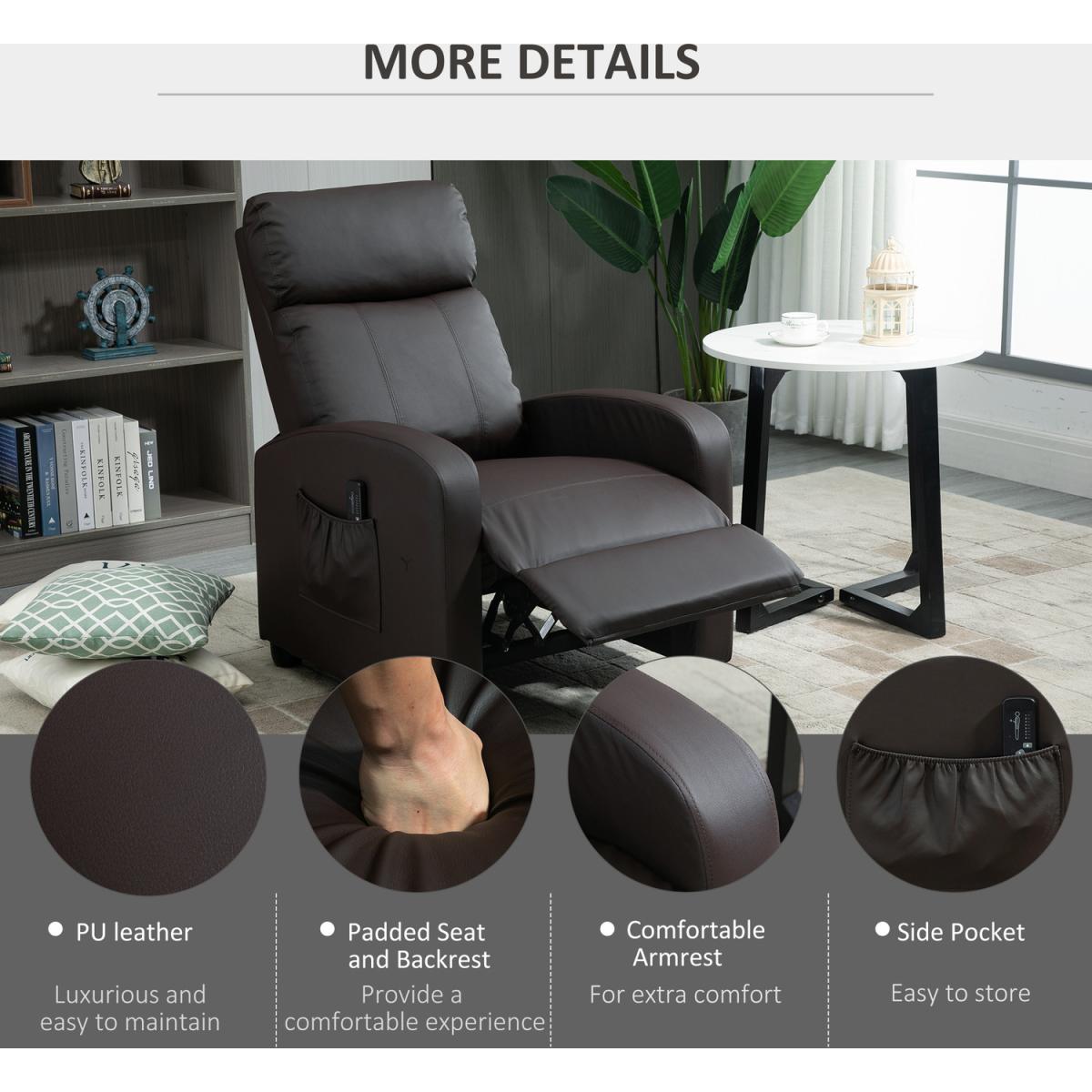 I’m a fan of this brown leather recliner because its clean lines and PU finish give it a smart yet hard-wearing look, while the built-in massage function adds everyday comfort. It sits equally well in a contemporary living room or a cosy media den, especially when paired with warm neutrals and timber accents. For practical styling, place it next to a slim‐leg side table with a simple lamp, then layer on a textured throw or cushion in a contrasting tone - say a soft grey or deep navy - to break up the dark upholstery. It also benefits from a low-pile rug beneath, which helps define its relaxation corner without adding bulk.