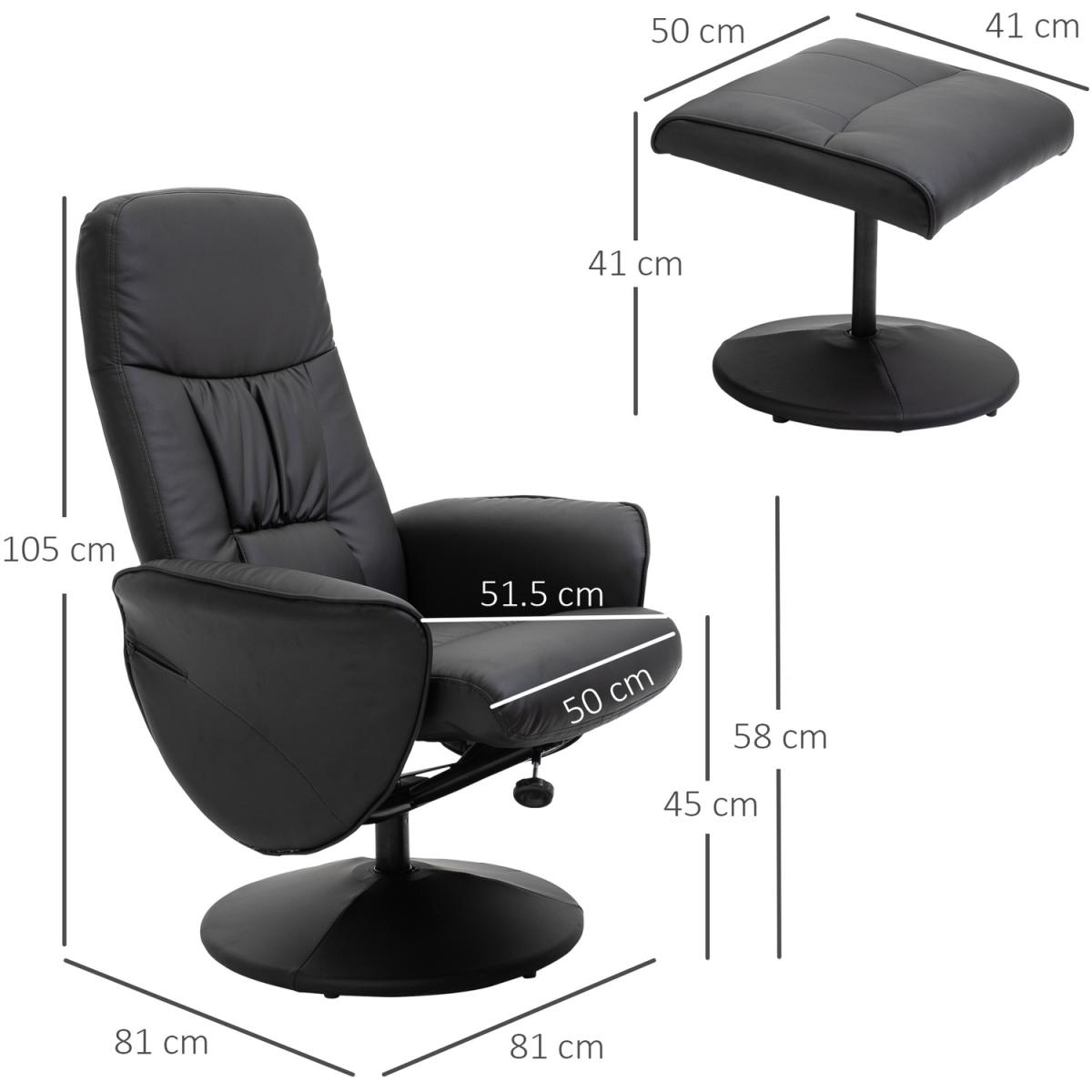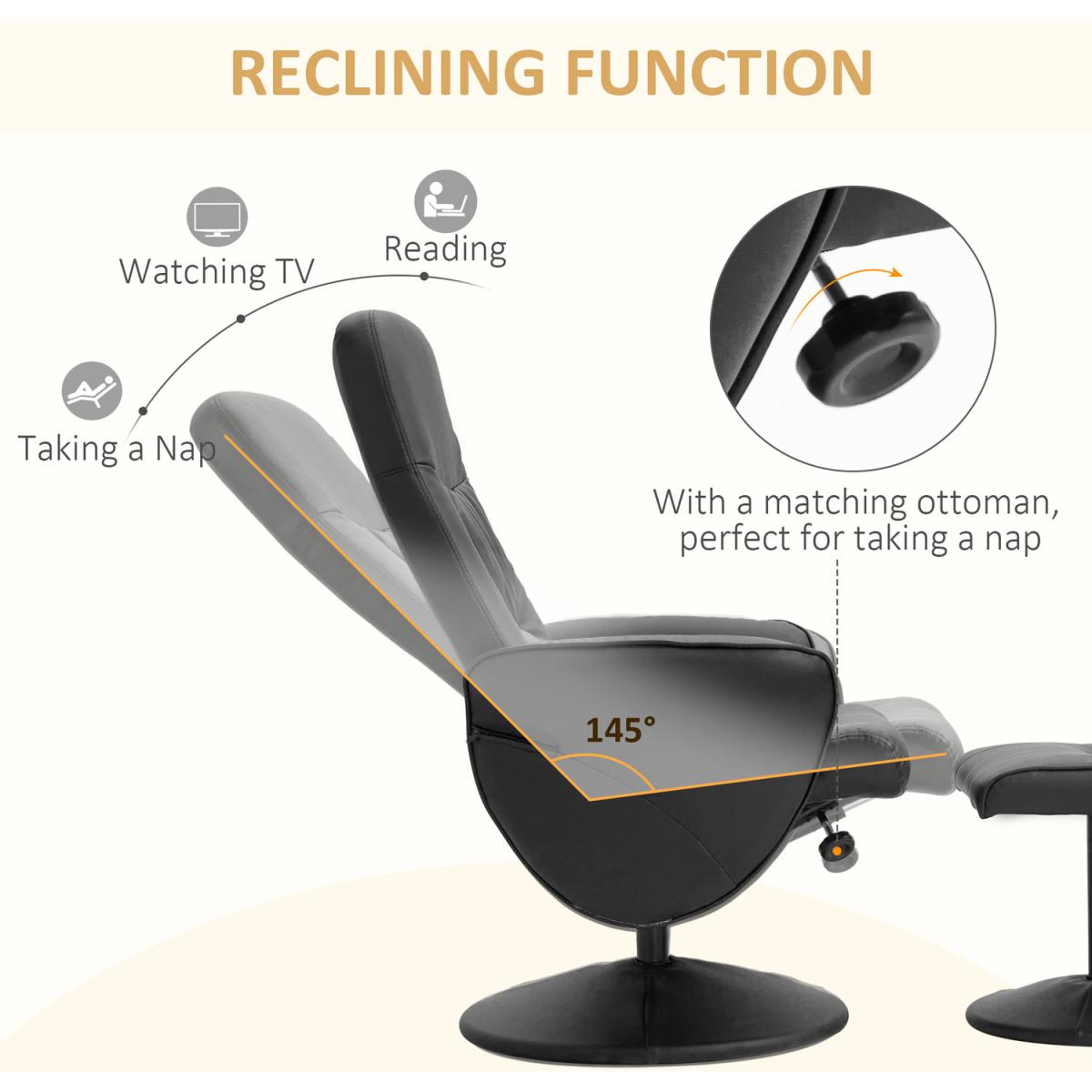 After a long day, nothing feels better than sitting in a big comfy recliner and relaxing. This HOMCOM manual recliner and stool set has got you covered. Padded all over for comfort, with smooth faux leather upholstery, the chair features a high back and curved armrests for plenty of support. Perfect for home and office lounging, you'll never want to stop relaxing!