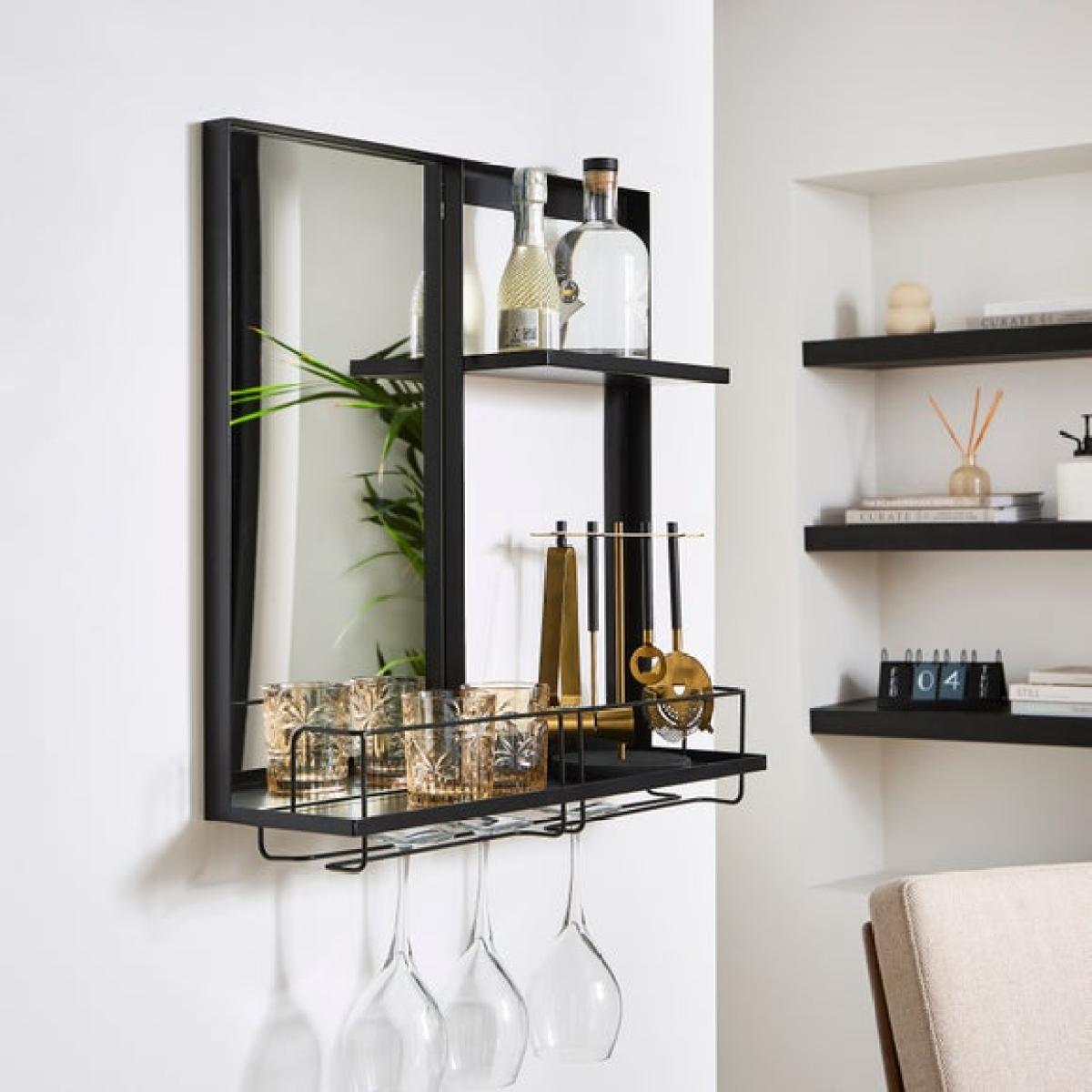 * Multifunctional wall mirror * Stylish black finish * Modern rectangular shape * Shelves for glasses and drinkware The Rectangle Cocktail Bar Wall Mirror blends sleek design with everyday practicality. Its bold black finish and clean rectangular shape bring a modern edge to any wall. Built-in shelves offer handy space for glassware, bar accessories or decorative touches, making it perfect for home entertaining. Whether in the kitchen, dining area or lounge, it turns a blank wall into a smart drinks station. A functional focal point with plenty of style.