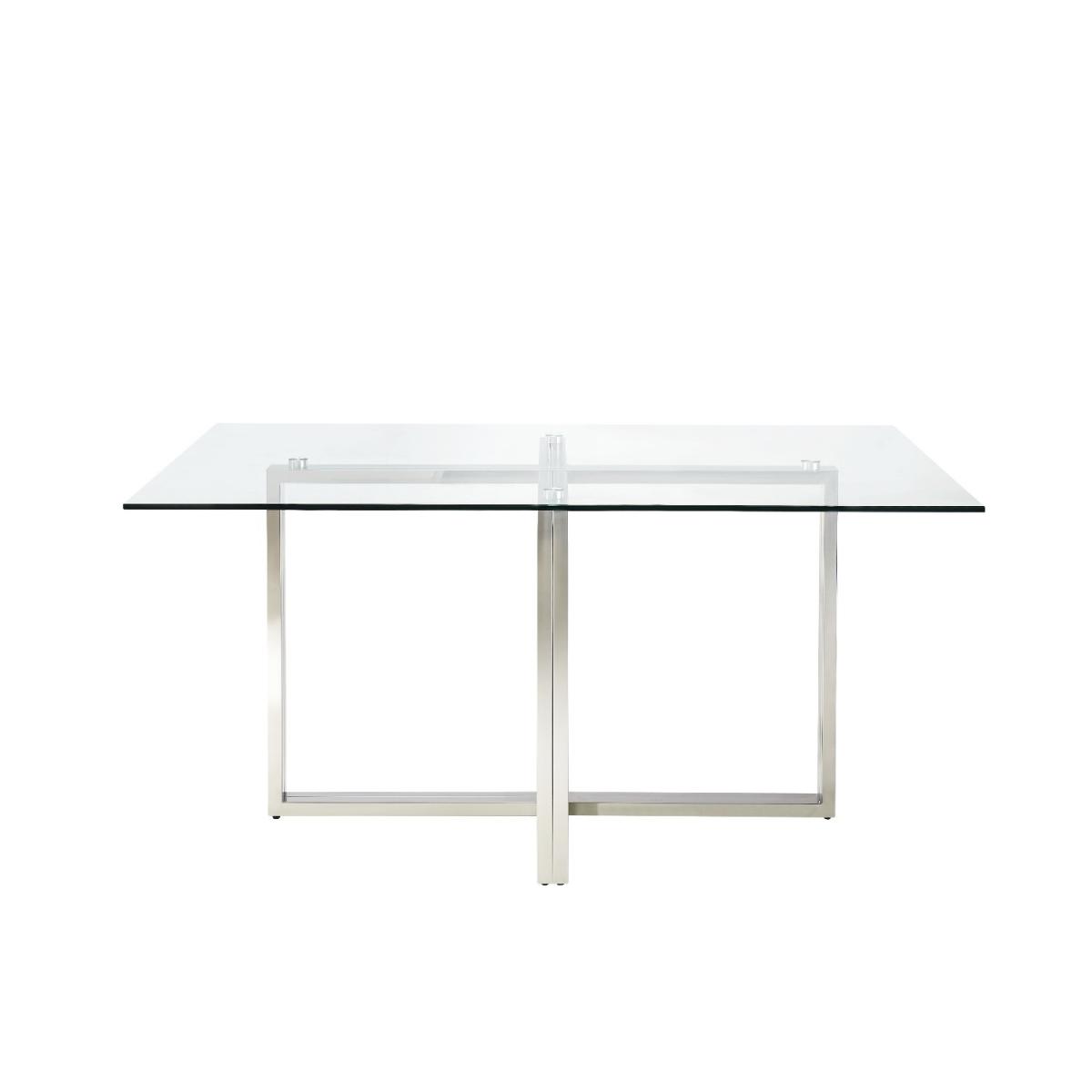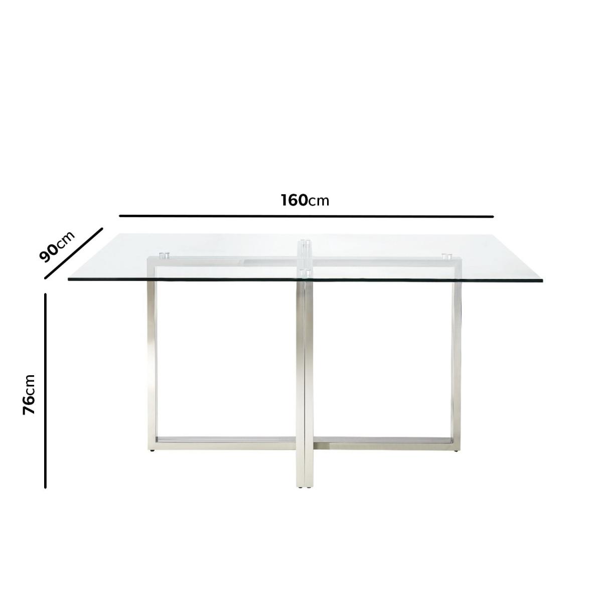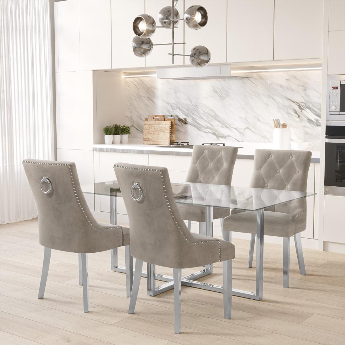 This bundle includes: 1 x Rectangle Glass Dining Table with Mirrored Legs 4 x Mink Velvet Dining Chairs Features we love Large dining set with rectangular glass dining table Seats up to 4 people for comfortable communal dining Comes with 4 mink knocker back chairs with velvet upholstery Tempered glass table top for added peace of mind Cross-frame base allows for extra leg room when dining Need to know Dining Table Information Dimensions::W160 x D90 x H76 cm Seats: 4 Shape: Rectangle Colour: Silver and transparent Finish: Tempered glass top and chromed legs Material: Glass and stainless-steel For use: Indoors Product weight: 33kg Assembly required: Yes - just the legs Dining Chair Information Number of chairs: 4 Dimensions: H92cm x W56 x D64cm Floor to seat: 49cm Max load weight: 120kg Material: Plywood and hardwood frame with a fully webbed sprung seat Finish: Mink velvet with Chrome stainless steellegs Assembly required: Yes Range: Jade Boutique