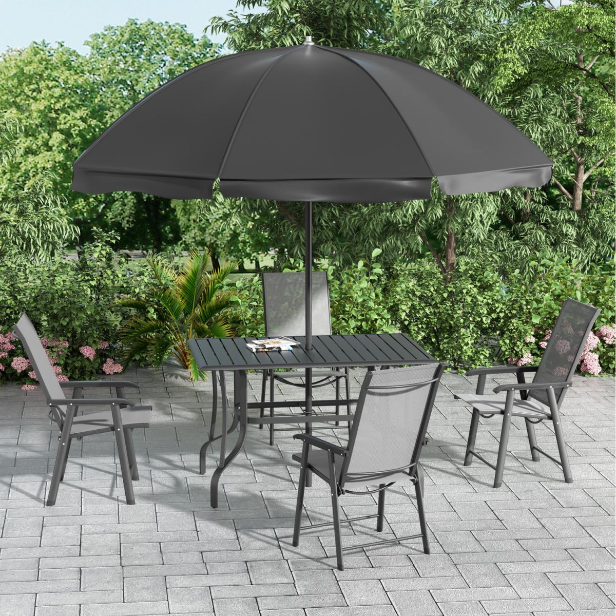 Enjoy refreshing mornings or evenings at our Coffee Table, perfect for chatting with friends. Made from durable metal with an anti-corrosion coating, this table combines style and resilience, adding a sophisticated touch to your outdoor space. It features a built-in parasol hole for easy umbrella installation. Accompanied by four folding chairs made of breathable fabric and metal, this set provides comfort and convenience for any gathering. Parasol Hole Size: 4.1cm Dia Parasols are not included.