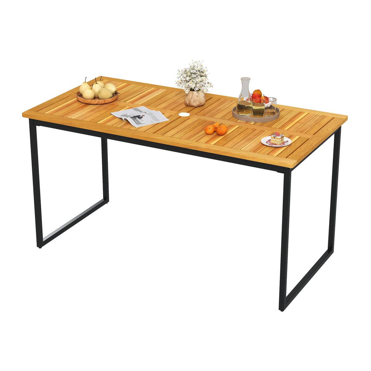 Multifunctional outdoor dining table with durability and functionality. The 140cm outdoor dining table offers ample space to comfortably seat up to 6 guests, making it ideal for hosting gatherings, parties, and family dinners outdoors. The patio table features a 5 cm umbrella hole with cover, allowing you to easily set up an umbrella for shade and create a cool oasis. The slatted tabletop is crafted from natural acacia wood for durability and beauty. Moreover, the heavy-duty metal frame boasts excellent stability. To ensure enhanced strength, the table is fortified with additional wood crossbars. Plus, there are adjustable foot pads to keep stability on uneven surfaces. The natural wood grain and flawless finish create an inviting ambiance that complements any outdoor decor style, making the farmhouse dining table an ideal choice for multiple occasions.