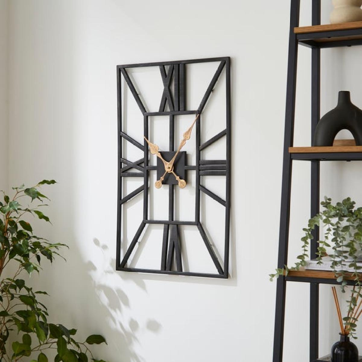 * Modern rectangular shape * Skeleton design * Black metal * Gold hands * Takes 1x AA battery (not included) Take your timekeeping to a stylish level with this Rectangle Skeleton Wall Clock. The geometric shape is marked out with bold black metal and gold hands create a great contrast, along with stylised roman numerals. Perfect for keeping time anywhere in the house.