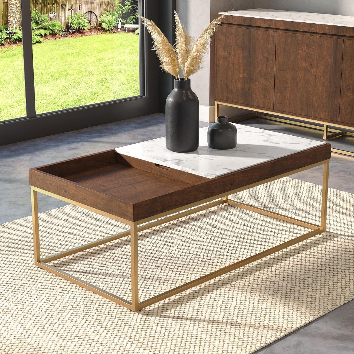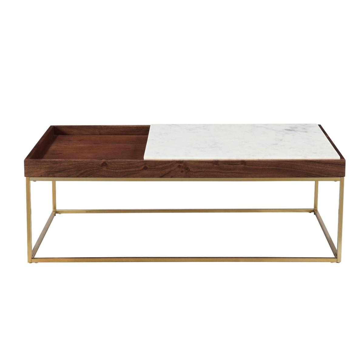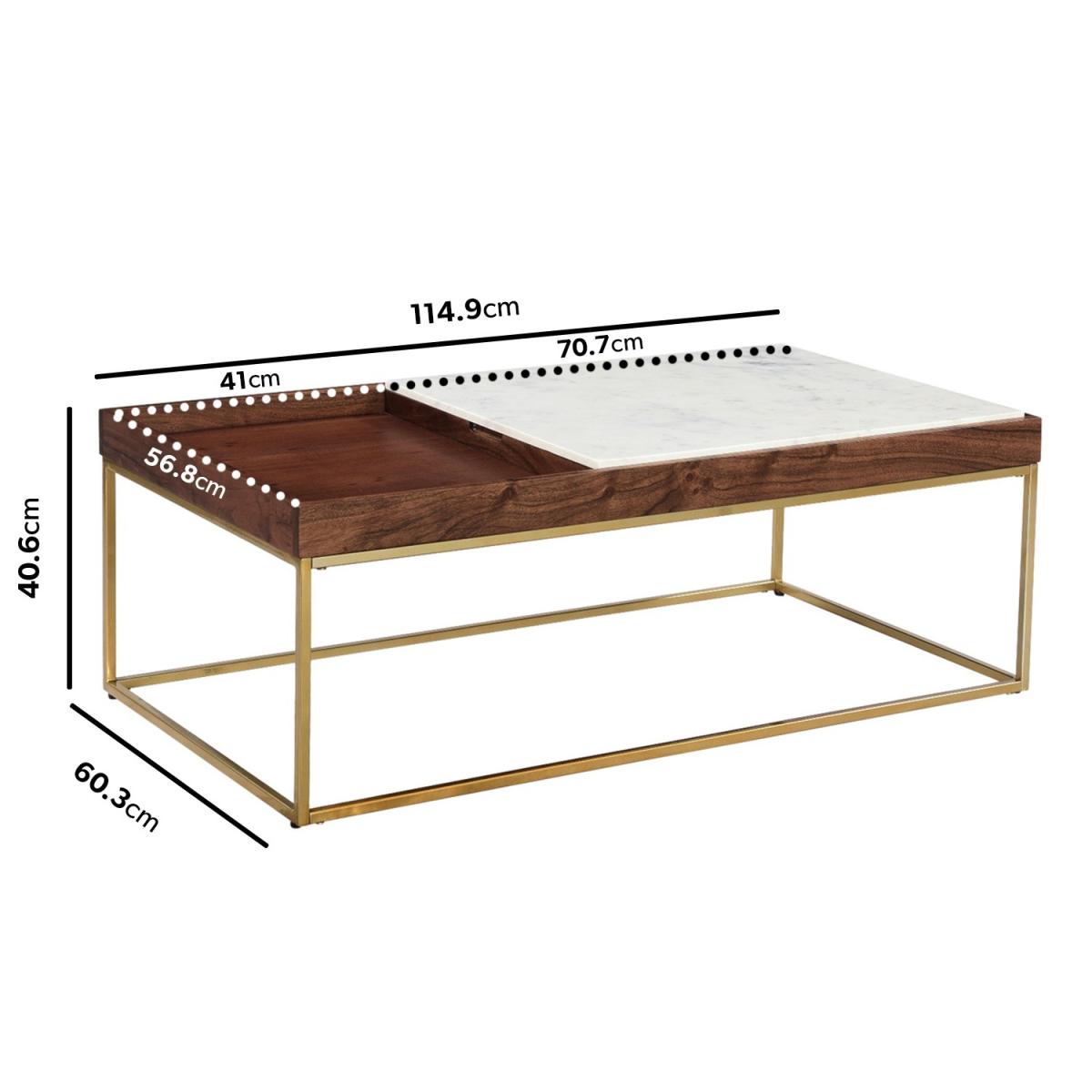 Features we love Solid walnut coffee table with a brass frame. Inlay tray feature for storage or accessories. Natural marble – no two pieces are the same. Open brass frame creates the illusion of space. Matching pieces also available in the Zola range. All about me. Add a touch of minimalism to your living space with this rectangular marble top coffee table. Made from solid walnut and real marble this unique piece will look great in any interior setting. The inlaid tray feature helps you to keep things tidy and also offers the perfect place to display home accessories. The brass coloured frame adds a modern feature and helps this table to become the centrepiece of your room. Need to know. Dimensions. H40.6 x W115 x D60.3 cm Shape. Rectangle Colour. Walnut and marble Finish. Solid walnut with marble Material. Solid walnut marble and metal Assembly required. Yes