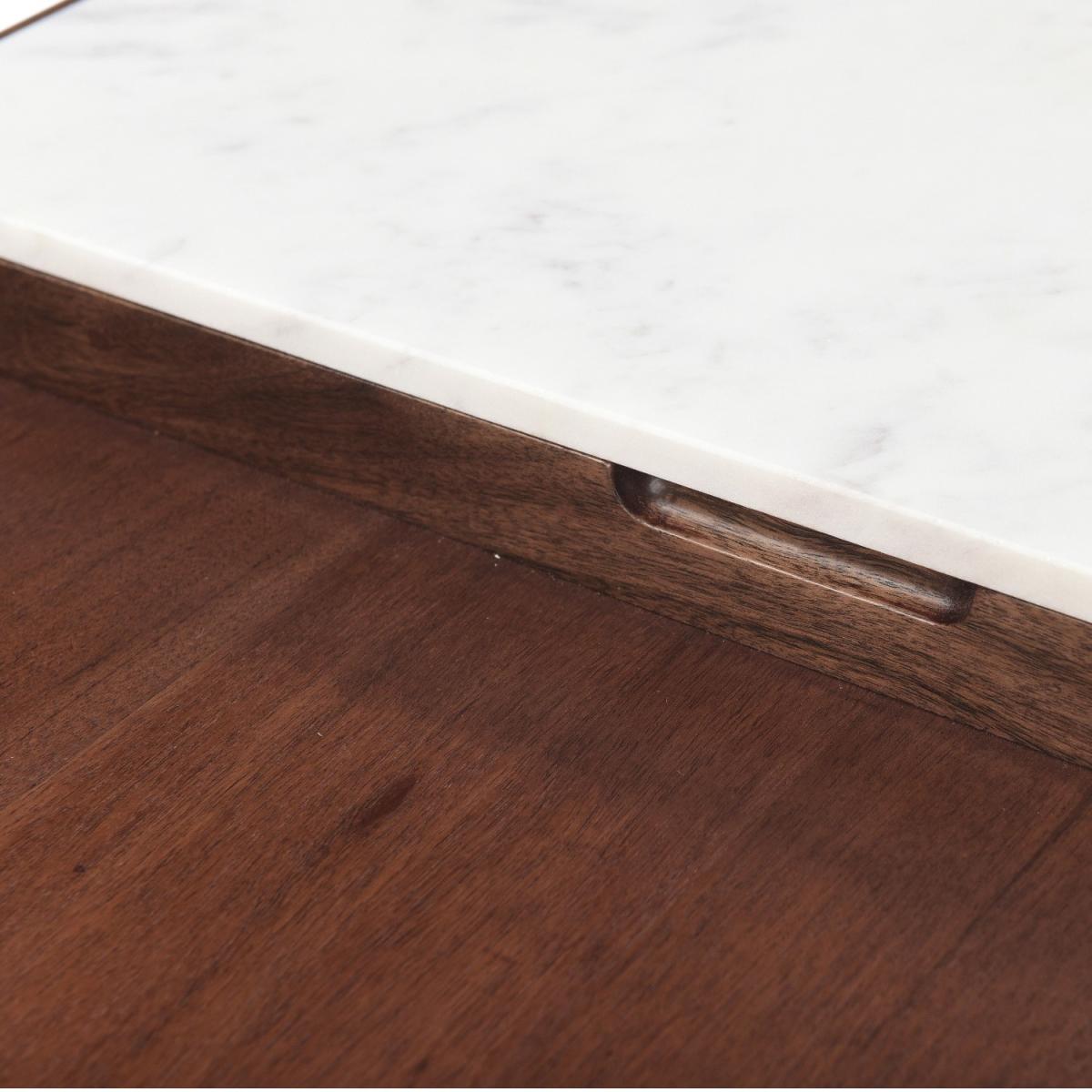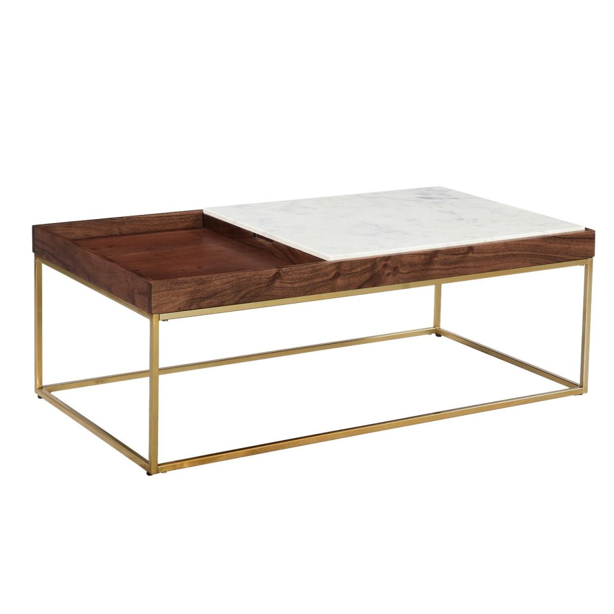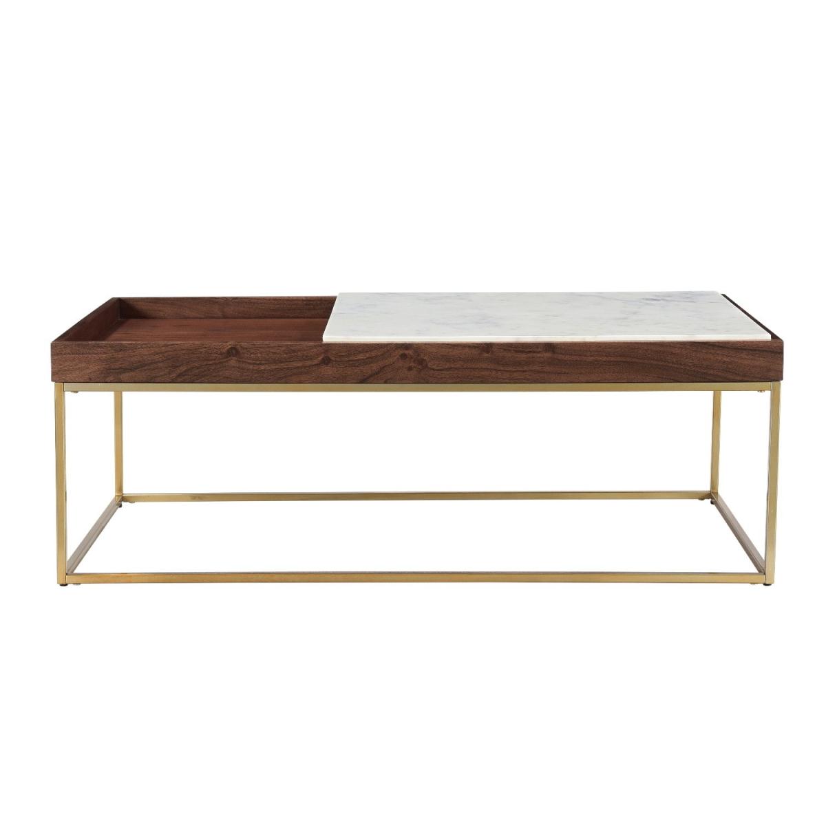 Features we love Solid walnut coffee table with a brass frame. Inlay tray feature for storage or accessories. Natural marble – no two pieces are the same. Open brass frame creates the illusion of space. Matching pieces also available in the Zola range. All about me. Add a touch of minimalism to your living space with this rectangular marble top coffee table. Made from solid walnut and real marble this unique piece will look great in any interior setting. The inlaid tray feature helps you to keep things tidy and also offers the perfect place to display home accessories. The brass coloured frame adds a modern feature and helps this table to become the centrepiece of your room. Need to know. Dimensions. H40.6 x W115 x D60.3 cm Shape. Rectangle Colour. Walnut and marble Finish. Solid walnut with marble Material. Solid walnut marble and metal Assembly required. Yes