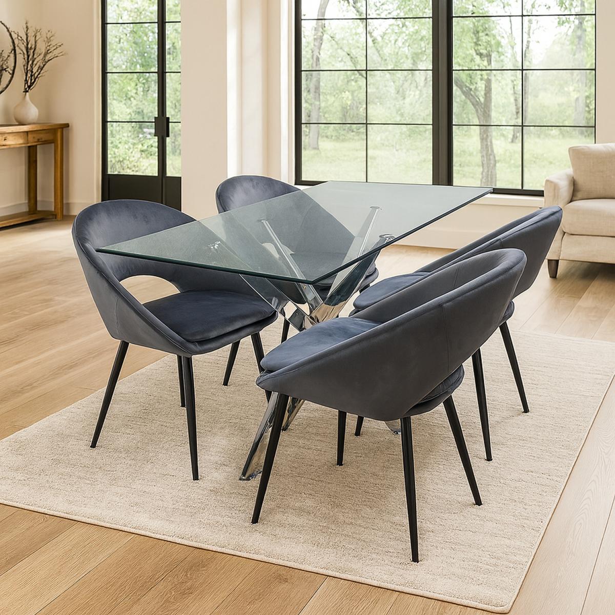 This elegant dining set features a clear glass rectangular table paired with four grey velvet chairs, combining modern design with comfort. The sleek tempered glass top is supported by chic chrome legs, while the plush velvet chairs add a touch of sophistication to your dining area. Perfect for everyday meals or entertaining guests, this set blends style, durability, and practicality. Features Clear tempered glass rectangular tabletop for a sleek, modern look Chic chrome legs for a stylish, contemporary finish Four grey velvet chairs for comfort and elegance Rubber-capped legs on table and chairs to protect floors from scratches Easy to assemble with all parts and clear instructions included Dimensions Table: 120 cm (L) x 70 cm (W) x 75 cm (H) Chair: 87 cm (H) x 59 cm (L) x 44 cm (W) Seat height: 45 cm