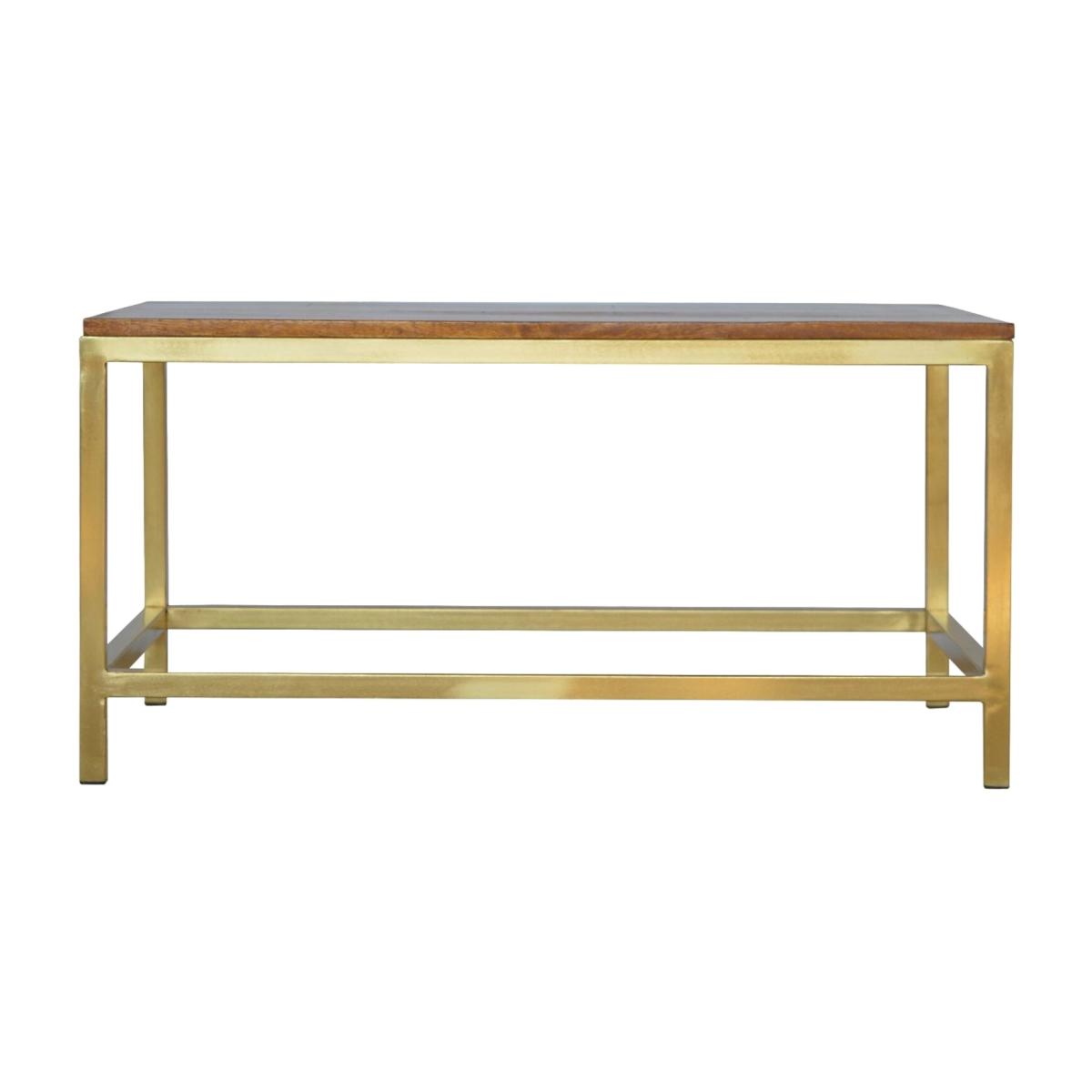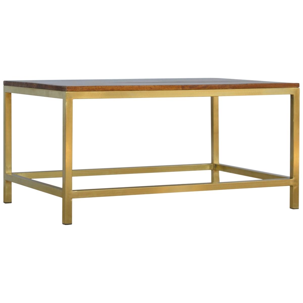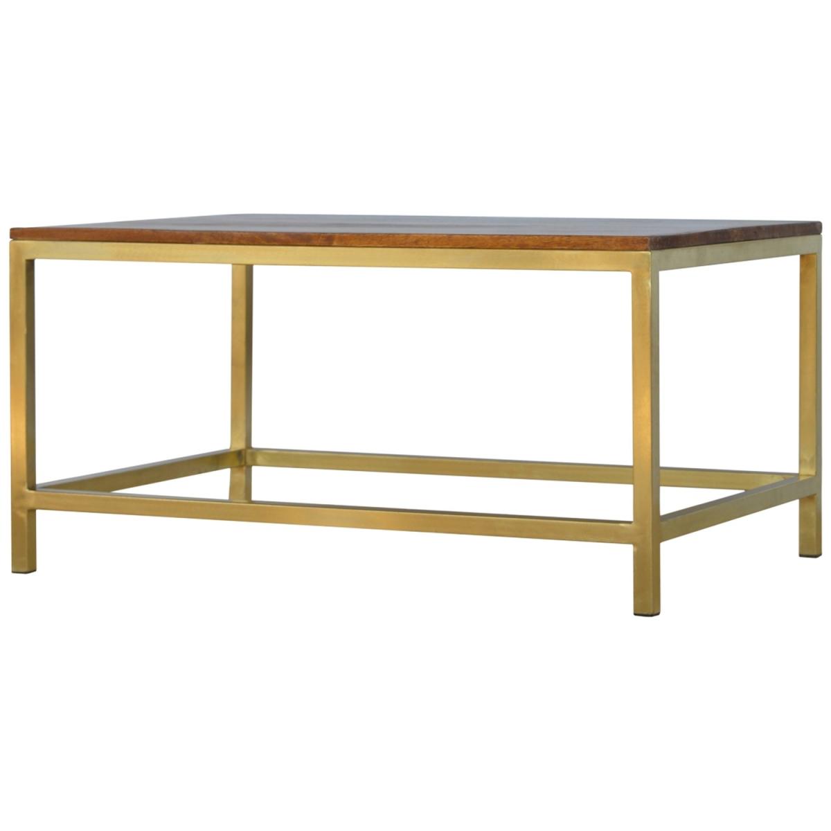 This rectangular coffee table has a refined shape and is topped with a lovely smooth chestnut finish. The perfect way to show off an industrial-style design, this modern coffee table fits into any type of interior. The top is constructed from 100 solid mango wood and the base legs are made from 100 metal which is finished in a beautiful brass gold.