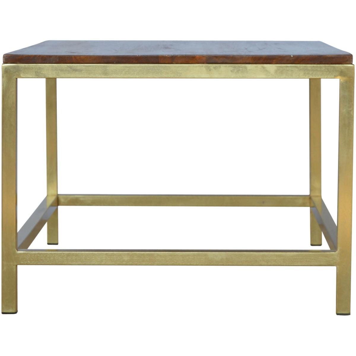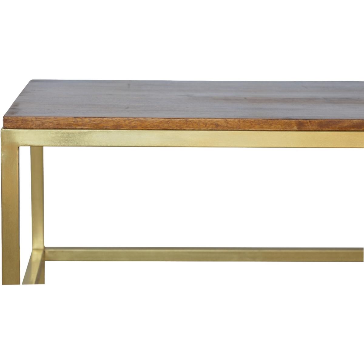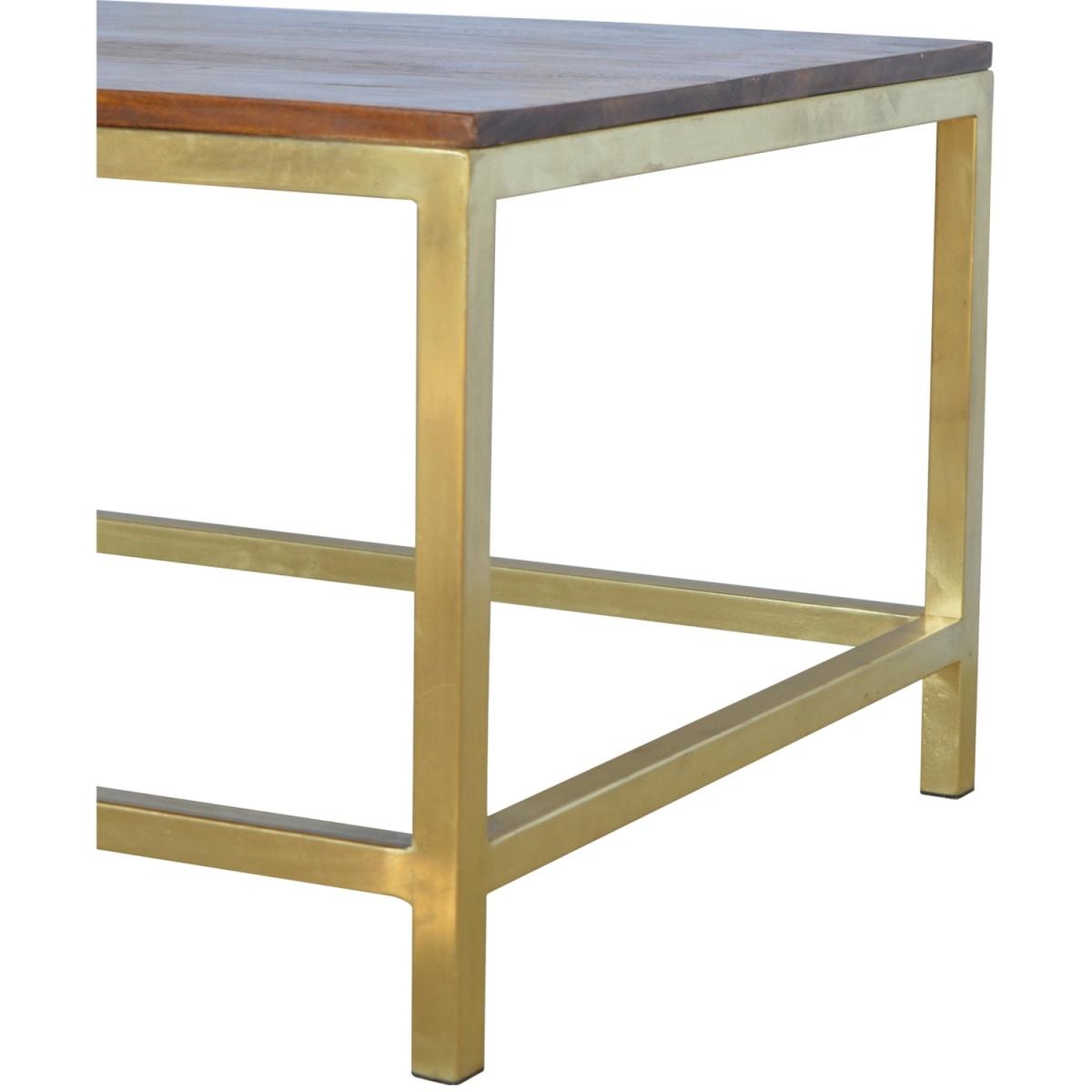 This rectangular coffee table has a refined shape and is topped with a lovely smooth chestnut finish. The perfect way to show off an industrial-style design, this modern coffee table fits into any type of interior. The top is constructed from 100 solid mango wood and the base legs are made from 100 metal which is finished in a beautiful brass gold.