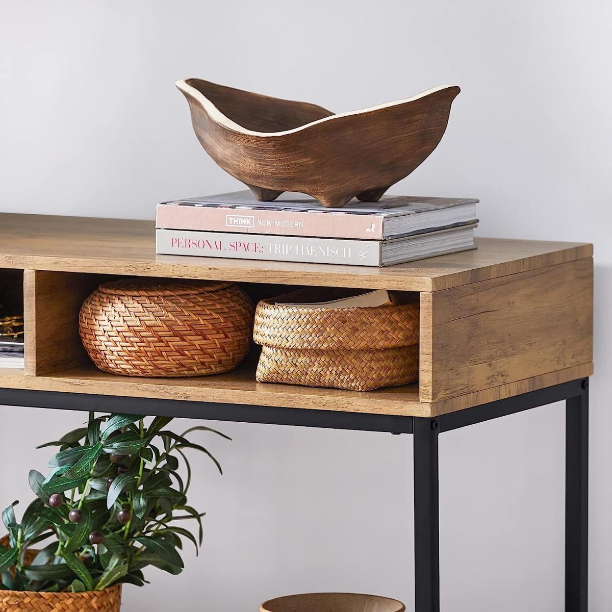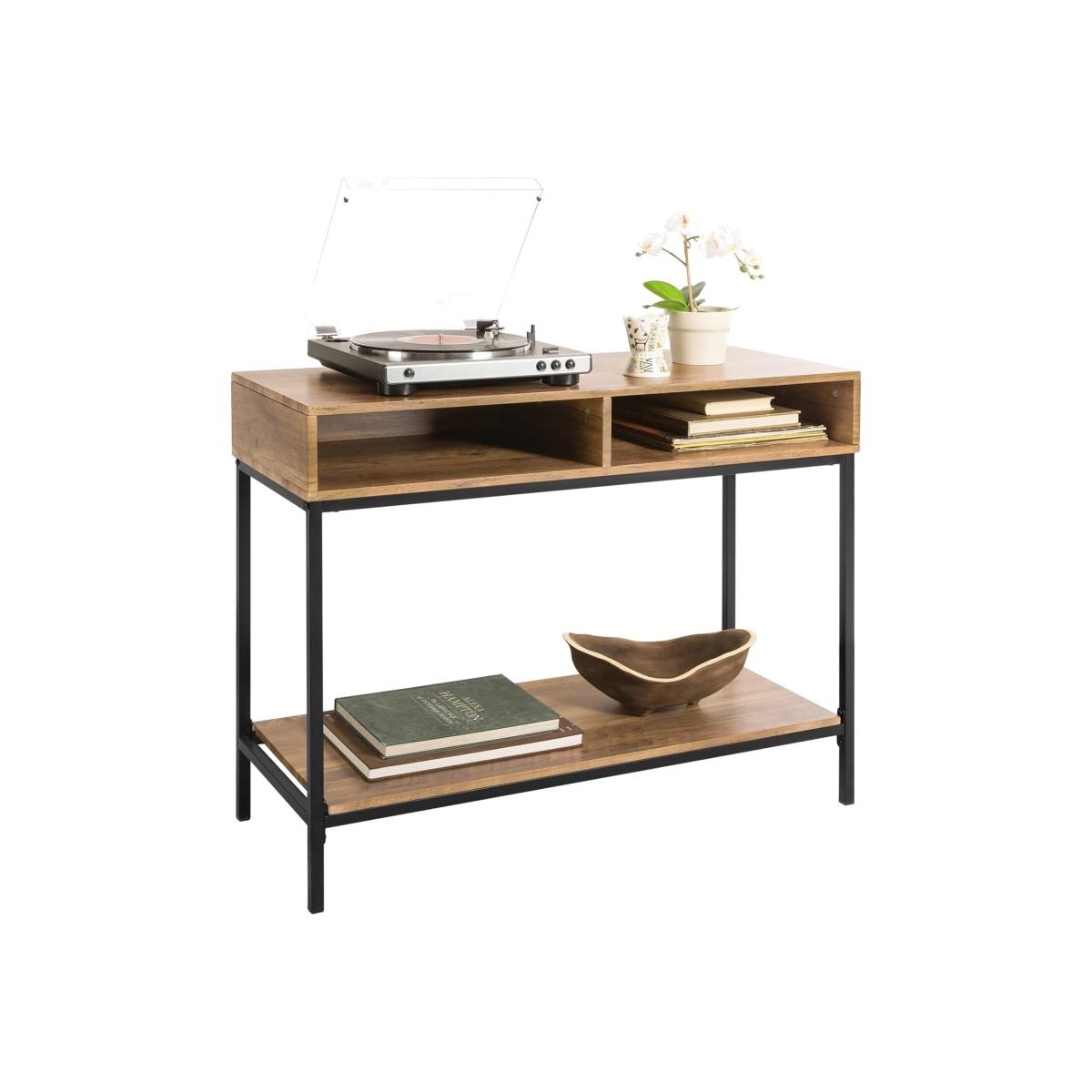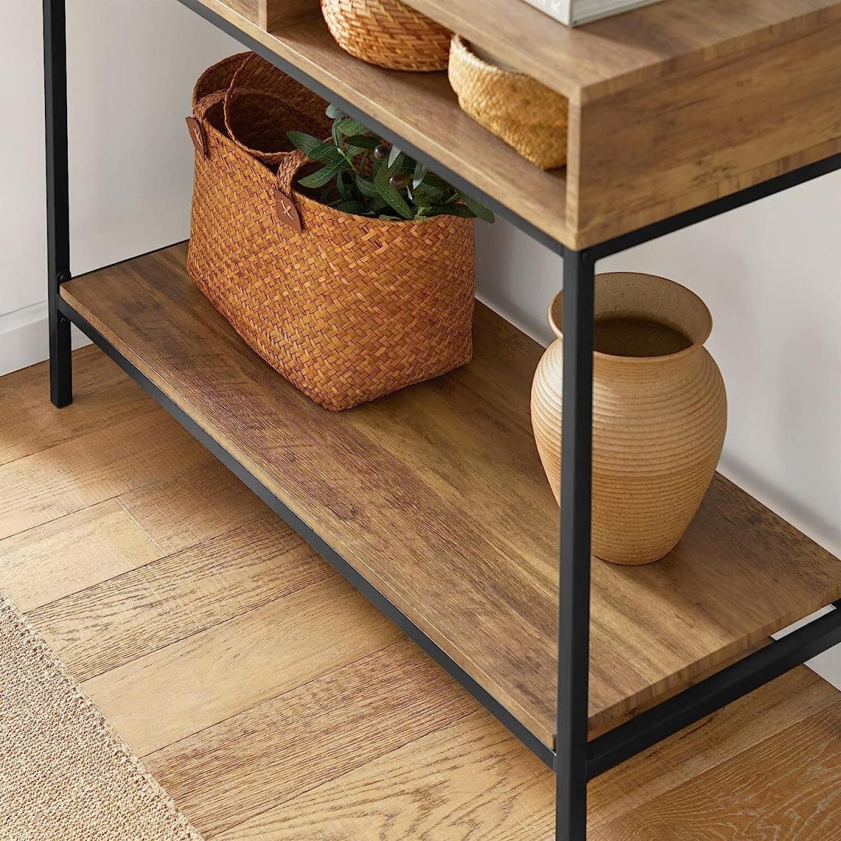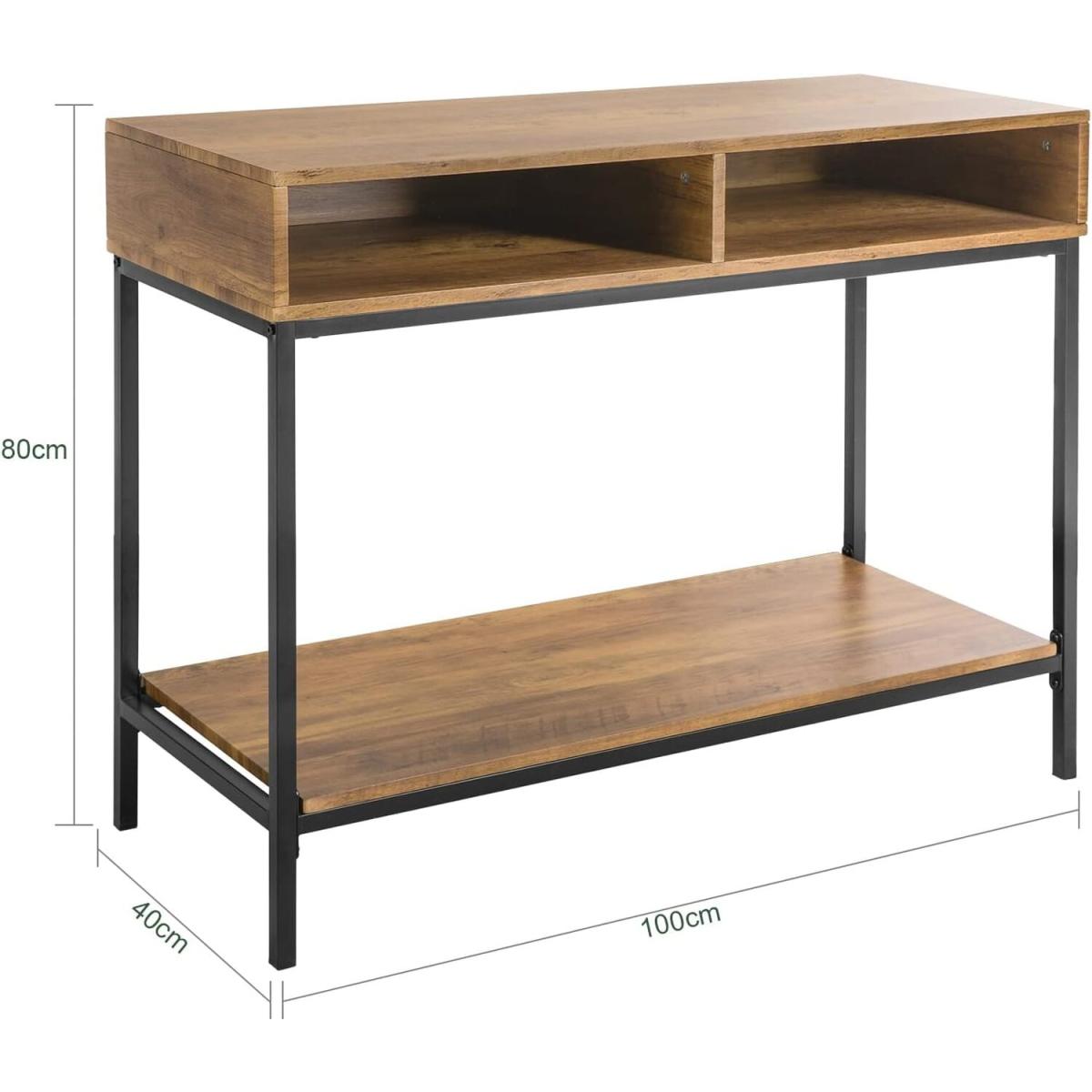 A diverse and contemporary product, would be suitable for a variety of locations, like hallway, living room and office. The top is ideal for storing something like keys and books you might need in reach, or photos and plants you want to display.2 open compartments and a storage shelf provide plenty of storage and display space for you. Made of high quality MDF with wooden effect and black powder coated steel frame. Stable and durable. It is very multi-functional due to the slender and clean design yet practical feature. The simple lines and subtle industrial style will give a contemporary twist to the focal point of any living room.