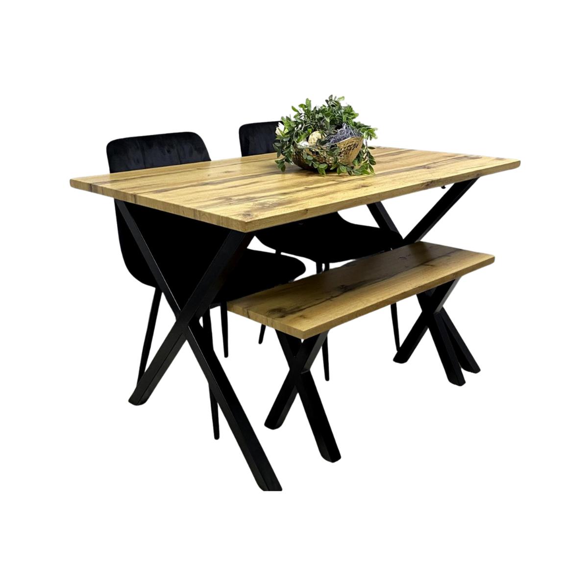 This set comes with two stunning black velvet chairs with a bench and a brown rectangular dining table. The dining table has durable construction reinforced with strong X-shaped iron legs for maximum stability. The set of two chairs with premium grey velvet fabric adds elegance to any room. The bench has a reinforced structure with curved veneer edges and sturdy X-shaped iron legs. The dinner table is crafted with high-quality MDF and a melamine laminated finish to ensure a durable long long-lasting tabletop. The dining chairs are made of premium velvet with metal chair legs.