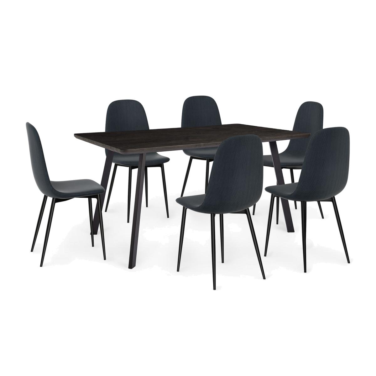 Stunning in its simplicity, the Von Haus dining table and chairs set creates a chic centrepiece in any dining room. The charcoal blue cord upholstery of the chairs complements the tables dark wood grain detailing effortlessly, bringing a characterful retro-inspired edge to your space. Introduce style into your dining room without compromising on functionality with this dining table and chairs set for 6, designed for aesthetics and stability. The robust metal table legs are finished with non-slip rubber feet, ensuring sturdy dinner party-proof use in any home. Meanwhile the gentle curvature, soft-touch polyester, and foam padding of the chairs promise a comfortable dining experience. Add a touch of luxe to weeknight meals, large family gatherings, and lavish dinner parties.