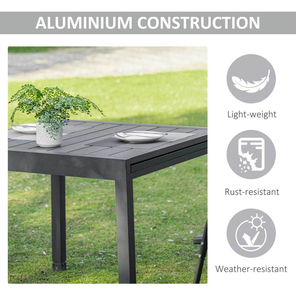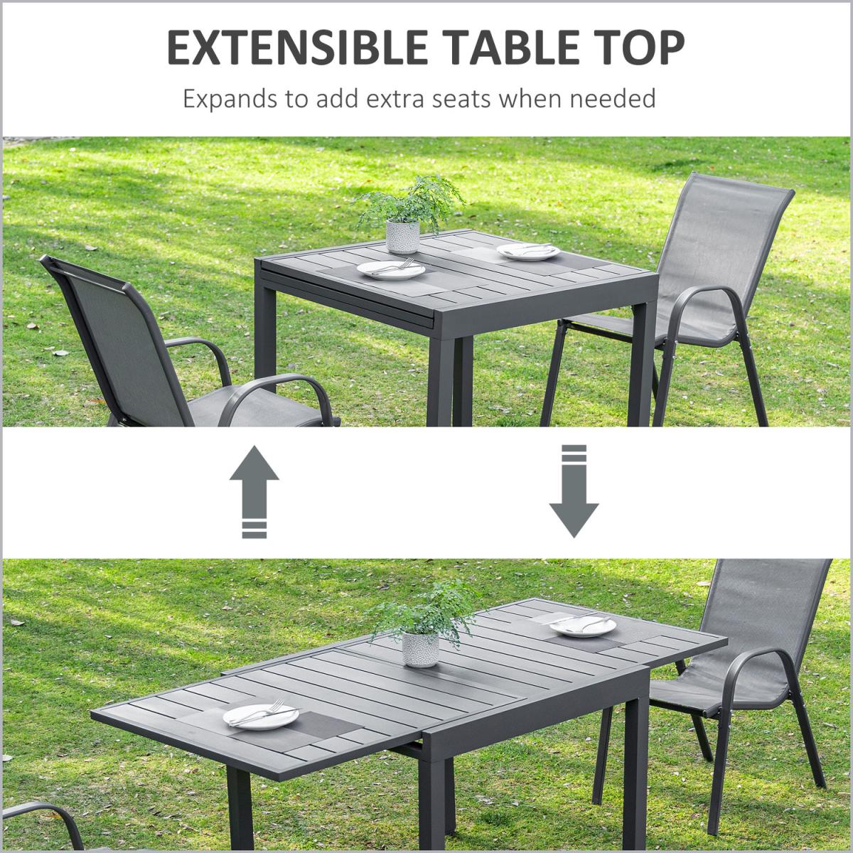 Pick a stylish addition for dining, afternoon tea and party on patios, decks with this garden dining table from Outsunny. The combination of the aluminium frame and wood-effect plastic top make it a durable piece. But most importantly, it can be extended between 90cm to 180cm. seating from four people to six - great for when you have a few extra guests over. Complete with adjustable feet to stand on uneven ground.