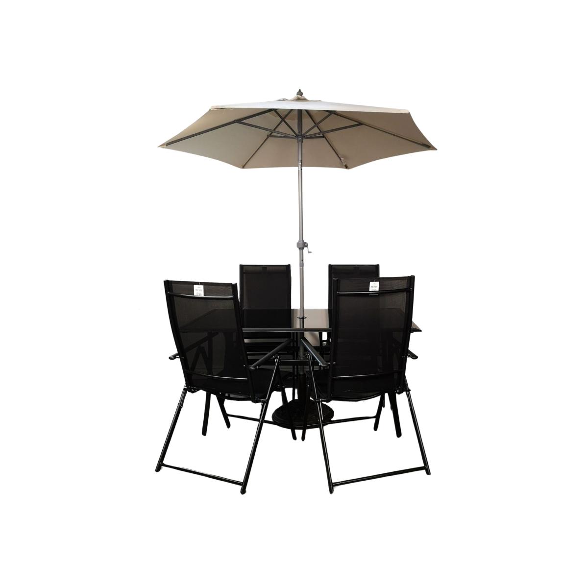 Relax and enjoy your leisure time this summer with this attractive glass top outdoor dining table and 4 chairs set with cream parasol and base. This stunning set will become the focal point to your garden, terrace or patio area making it ideal for dining on or just enjoying drinks in the summer sun and has space for up to 6 seats. Having an outdoor patio furniture set can greatly enhance your outdoor living space and creates a comfortable and inviting space for you to relax, entertain, and enjoy nature. The set includes a black, rectangular tempered glass top table with 4 multi-position chairs, cream parasol and parasol base. Having a black steel set will blend seamlessly with its surroundings. It adds sophistication and a sleek, modern touch to your patio or garden. The frame of the table and chairs are made from steel and have been finished with a powder coating for added strength and durability. The chairs have a textilene backing and they can easily be folded away when not in use for easy and convenient storage. Choose from various positions to recline by adjusting the seat handles to sit back and unwind. With a parasol and base included you can shield yourself from the sun. The umbrella parasol is designed to provide ample coverage allowing you to stay cool, comfortable and protected in your outdoor space. This garden parasol offers a sleek and modern design with it's cream canopy and grey aluminium poles which will add that touch of sophistication to any outdoor setting. Wind the plastic crank handle to open and close the umbrella and the tilt function is activated by the press of a button. The cast iron effect parasol base has been made with strong resin materials that make a great addition to any garden decor. Choose the correct spacers and adjust the tightening knob for a secure fit for the parasol. The set is supplied flat packed and self assembly is required.