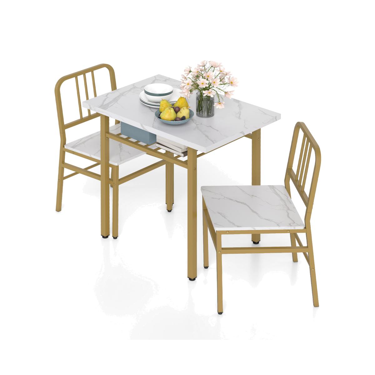 Aesthetically pleasing and compact dining table set for 2 people. The kitchen chairs of the space-saving 3-piece dining table set feature a perfect tilt angle, ensuring a cosy dining experience. Plus, the dining table set is designed with a built-in storage rack underneath the table, which allows you to neatly organize your dining essentials and keep them within easy reach. Additionally, the chairs can be neatly tucked away under the table after the meal, making it ideal for smaller dining areas or cosy spaces.