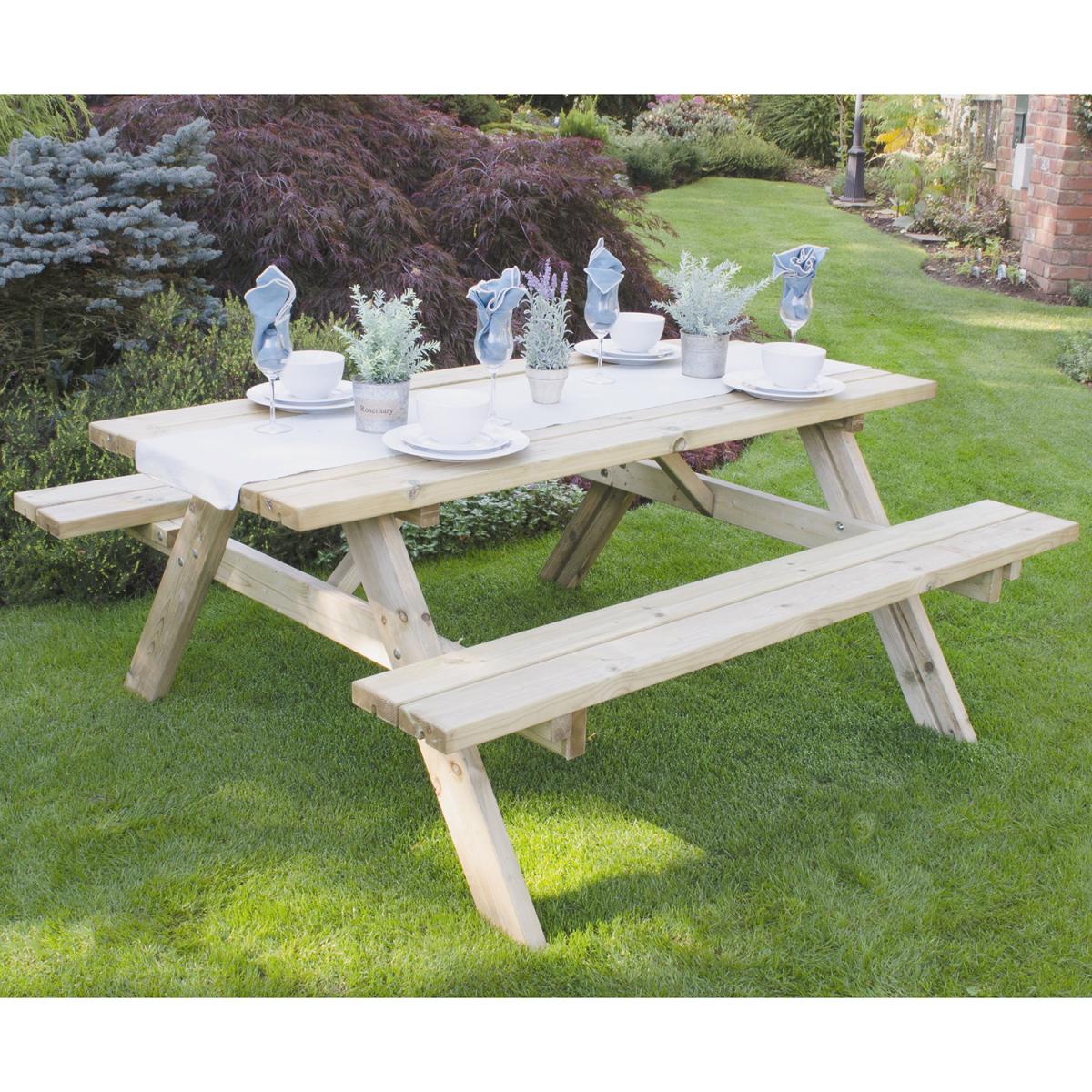 This Rectangular Picnic Table is the easy solution to lots of outdoor dining, helping you bring friends and family together in the gorgeous summer weather. Able to seat up to eight adults, this Picnic Table is manufactured from sustainable, smooth-planed timber for a safe, splinter-free, and comfortable placer to sit. All timber used for this table has been pressure treated, helping it avoid rot and fungal decay for at least fifteen years. The natural pale timber colour makes this Picnic Table prime for painting, so you can fit it into your garden's decor perfectly. Delivered flat packed for easy self-assembly, all fixings and instructions needed are included.