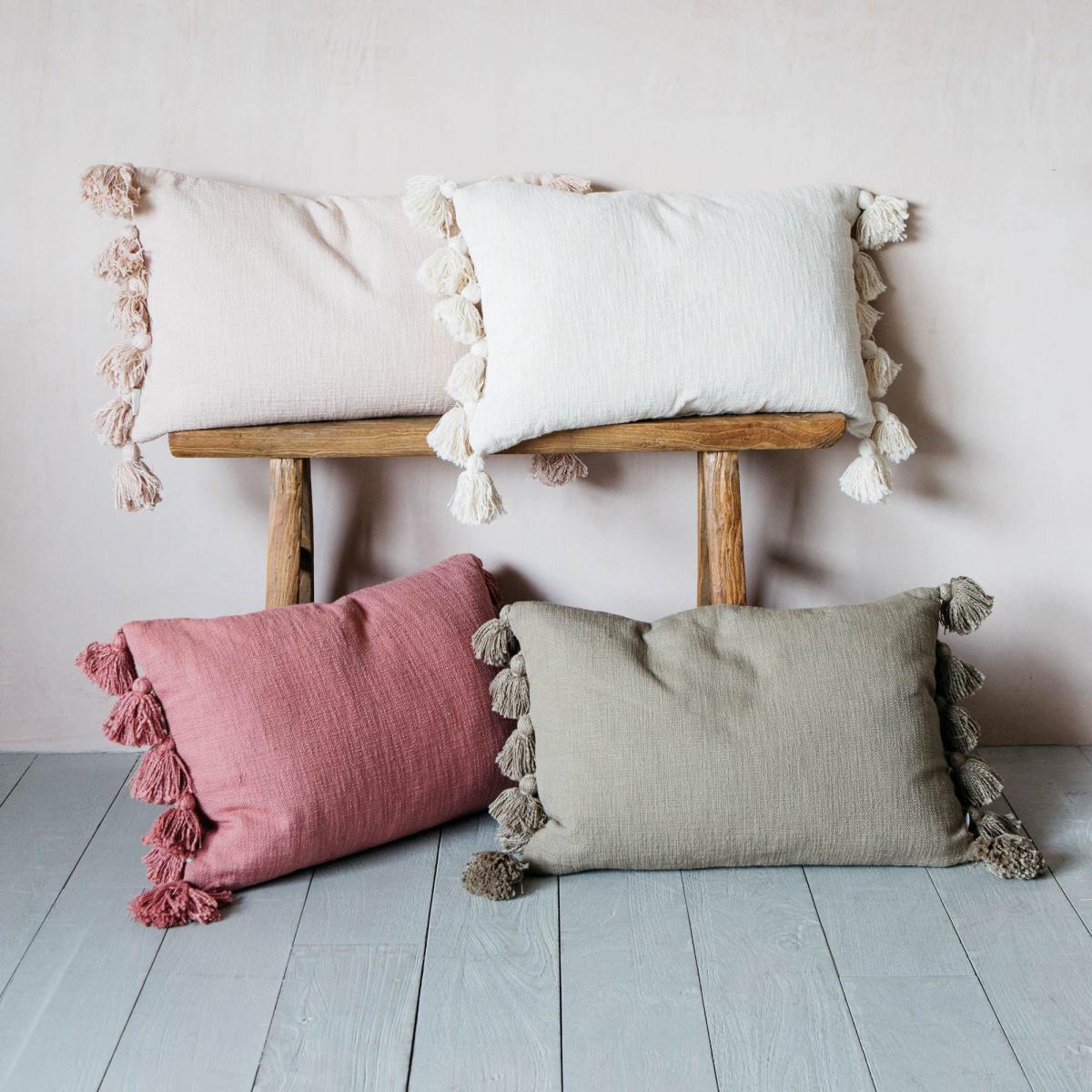 I love this cushion for adding a touch of subtle texture and a bit of playful detail to any space. The rectangular shape makes it versatile for both sofas and beds, while the tassels give it a relaxed, boho vibe that works well in informal or eclectic interiors. It's particularly effective layered with other cushions in neutral tones or soft pastels, making it ideal for creating a cosy, inviting look in living rooms or bedrooms. For styling tips, consider pairing it with natural fabrics and wooden furniture to enhance its tactile appeal, or use it as a statement piece by placing it across larger cushions for a layered, yet understated, effect. Its understated elegance makes it a great everyday cushion that can effortlessly elevate the overall aesthetic.