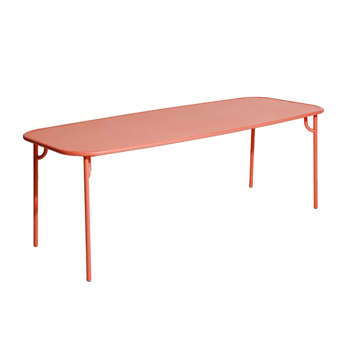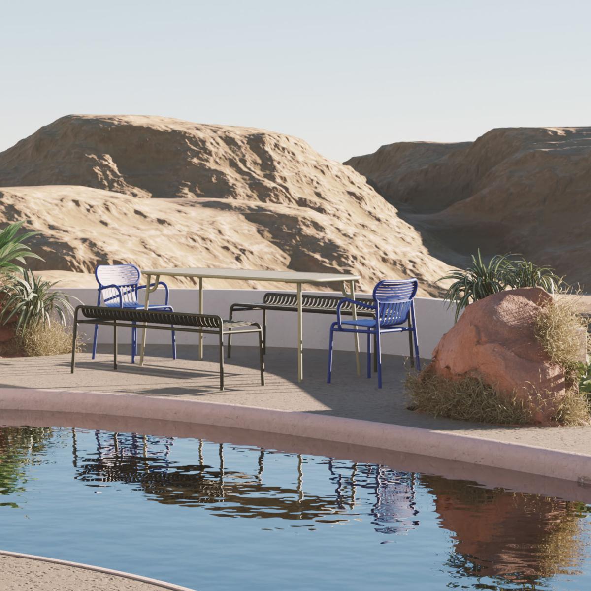 Cheerful, colourful and graphic, the Week-End collection brings life to your garden! This aluminium furniture is lightweight, mobile and easy to handle: a perfect collection for creating a modern outdoor lounge or a nice dining area on a terrace or in a kitchen. Designed for intensive outdoor use, this design garden furniture line is entirely coated with a matte-finish texture powder paint and an anti-UV treatment which does not emit VOCs, in order to ensure colours continue to look flawless over time. The aluminium structure, meaning there is no risk of rust or corrosion even by the seaside, makes each piece lightweight and durable. The Week-End collection has been designed by French studio Brichet. Ziegler. The oval, encircled shape creates the backrests so that they become a graphic sign. The work of the horizontal and vertical slats, like stripes, emphasises the full and empty spaces, affirming the collection’s identity. This aluminium table has been designed to withstand the tests of time. Ideal for sitting up to eight people, it perfectly goes with the Week-End design garden chairs or stools, bringing life to your terrace or balcony, and providing the perfect setting for hosting dinners with friends and family, parties, and aperitifs. Thanks to the wide colour range, combining muted tones and bold colours, Week-End enables you to create unique and daring outdoor compositions.