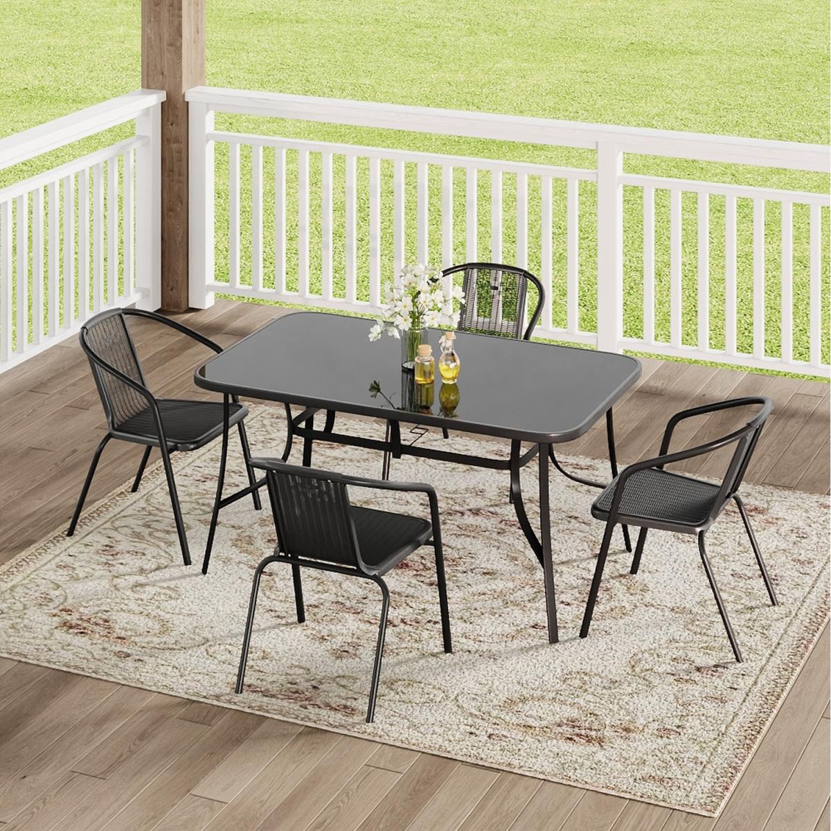 Inspired by traditional wrought iron furniture this garden table adds a romantic touch to your outdoor space Its classic black finish and simple elegant design make it a stylish addition to any garden or terrace Combining good looks with high quality the practical tabletop is built to last A central umbrella hole means it is suitable for use in both sunny and rainy weather The set also includes four rattan chairs made from all weather resistant PE rattan and supported by a rustproof metal frame ensuring they are durable and stable for outdoor dining