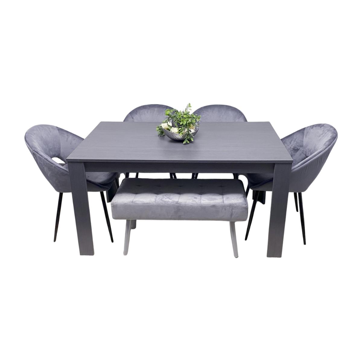 This stunning, dark grey rectangular dining table set features four chairs upholstered in premium grey velvet, adding a touch of elegance and comfort to any room. The table boasts a sleek, modern design with durable powder-coated metal legs, ensuring lasting stability. The high-quality velvet chairs offer both style and softness, while rubber-capped legs on all pieces protect your floors from scratches.