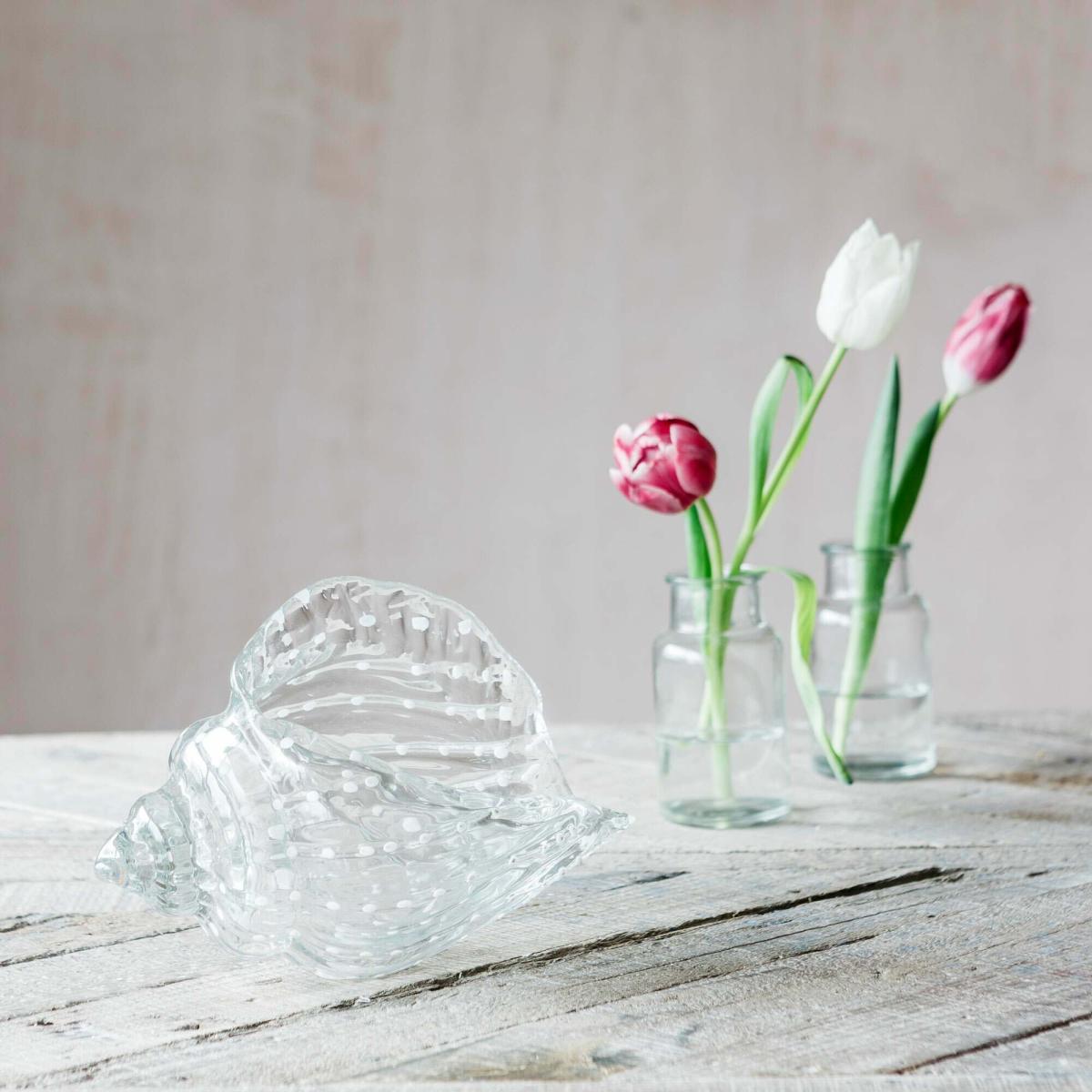 I love the vibe of the recycled glass shell - it brings texture and a touch of coastal charm to any space. It works particularly well in minimalist or boho interiors where natural and sustainable materials are celebrated. I’d suggest displaying it on a side table, coffee table, or open shelf, paired with neutral or pastel ceramics and greenery to highlight its organic shape and translucent quality. Keep styling simple to let the glass shell be the focal point, and consider placing it in well-lit areas where natural light can enhance its transparency and subtle details. It’s versatile enough to work in living rooms, bathrooms, or even bedrooms - a charming piece that adds visual interest while quietly emphasising eco-conscious design.
