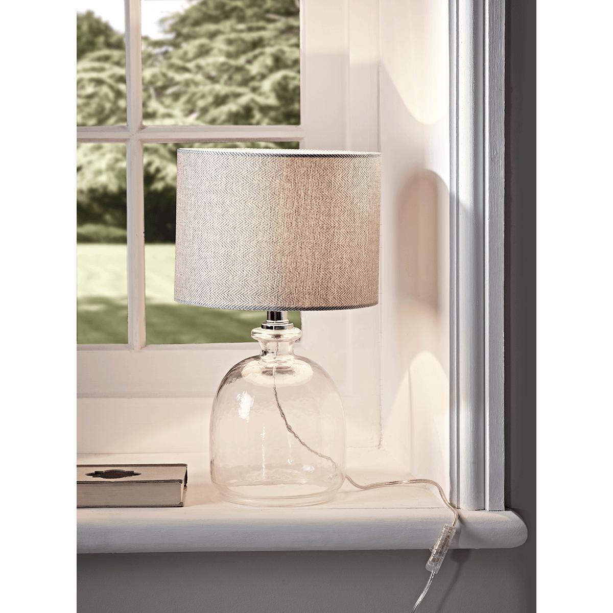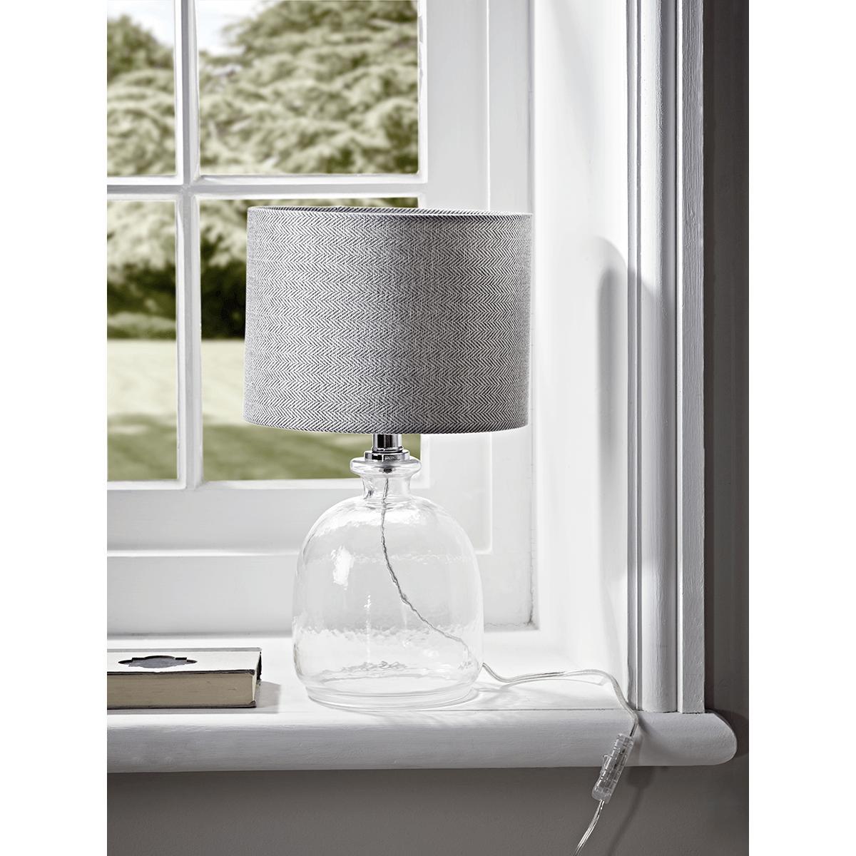 With a grey cotton shade woven in an attractive herringbone pattern, our perfectly petite table lamp is crafted from recycled glass and a beautiful domed shape. Each lamp has an elegant neck and chrome fittings.