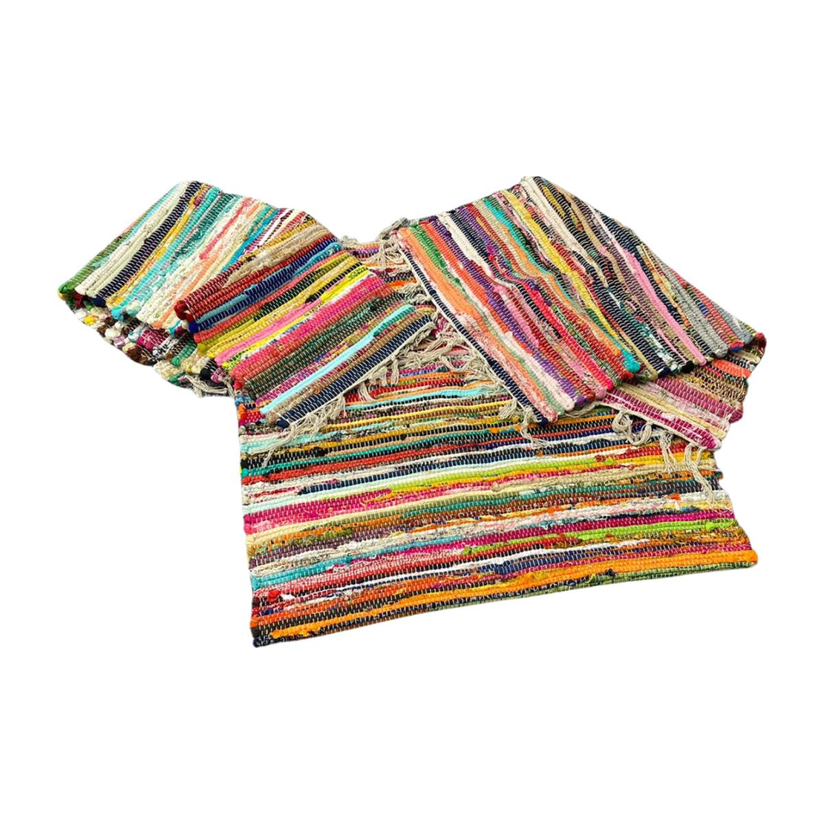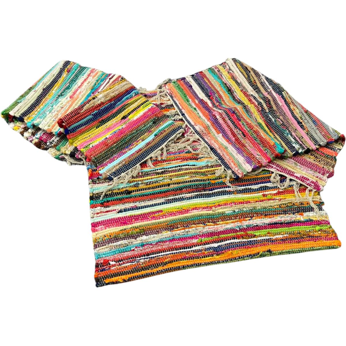 These chindi rag rugs will brighten the floor with their unique colours. This rug brings a colourful splash to your home. These multi-coloured rugs could easily be used in any area like bedrooms, hallways, conservatory, living room, dining room rug children room rug. Our handmade flat-woven rug using traditional handlooms. The design of the rug looks classic, gorgeous which make your floor attractive. This colourful area rag rug is handmade with a wide range of bright and vibrant tones, giving a splash of different colours makes it a great addition to your home. Quality of material which long last and durable and its heavyweight, which are tightly held on the surface that provides you to walk easily and comfortably. These multicolour rag rugs are carefully woven which looks perfect on every side and are tightly hemmed. Made predominantly from recycled cotton and other mixed recycled fabric, thus it is made of 100% recycled materials which are washed and dyed before making your rag chindi rug. These chindi rugs have unique colours, all look different from the next one as shown in the image, you can get an idea of how would it feel to place on the floor and represents its uniqueness.