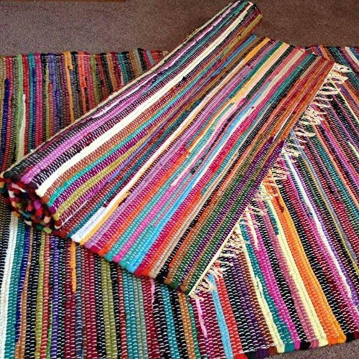 These chindi rag rugs will brighten the floor with their unique colours. This rug brings a colourful splash to your home. These multi-coloured rugs could easily be used in any area like bedrooms, hallways, conservatory, living room, dining room rug children room rug. Our handmade flat-woven rug using traditional handlooms. The design of the rug looks classic, gorgeous which make your floor attractive. This colourful area rag rug is handmade with a wide range of bright and vibrant tones, giving a splash of different colours makes it a great addition to your home. Quality of material which long last and durable and its heavyweight, which are tightly held on the surface that provides you to walk easily and comfortably. These multicolour rag rugs are carefully woven which looks perfect on every side and are tightly hemmed. Made predominantly from recycled cotton and other mixed recycled fabric, thus it is made of 100% recycled materials which are washed and dyed before making your rag chindi rug. These chindi rugs have unique colours, all look different from the next one as shown in the image, you can get an idea of how would it feel to place on the floor and represents its uniqueness.