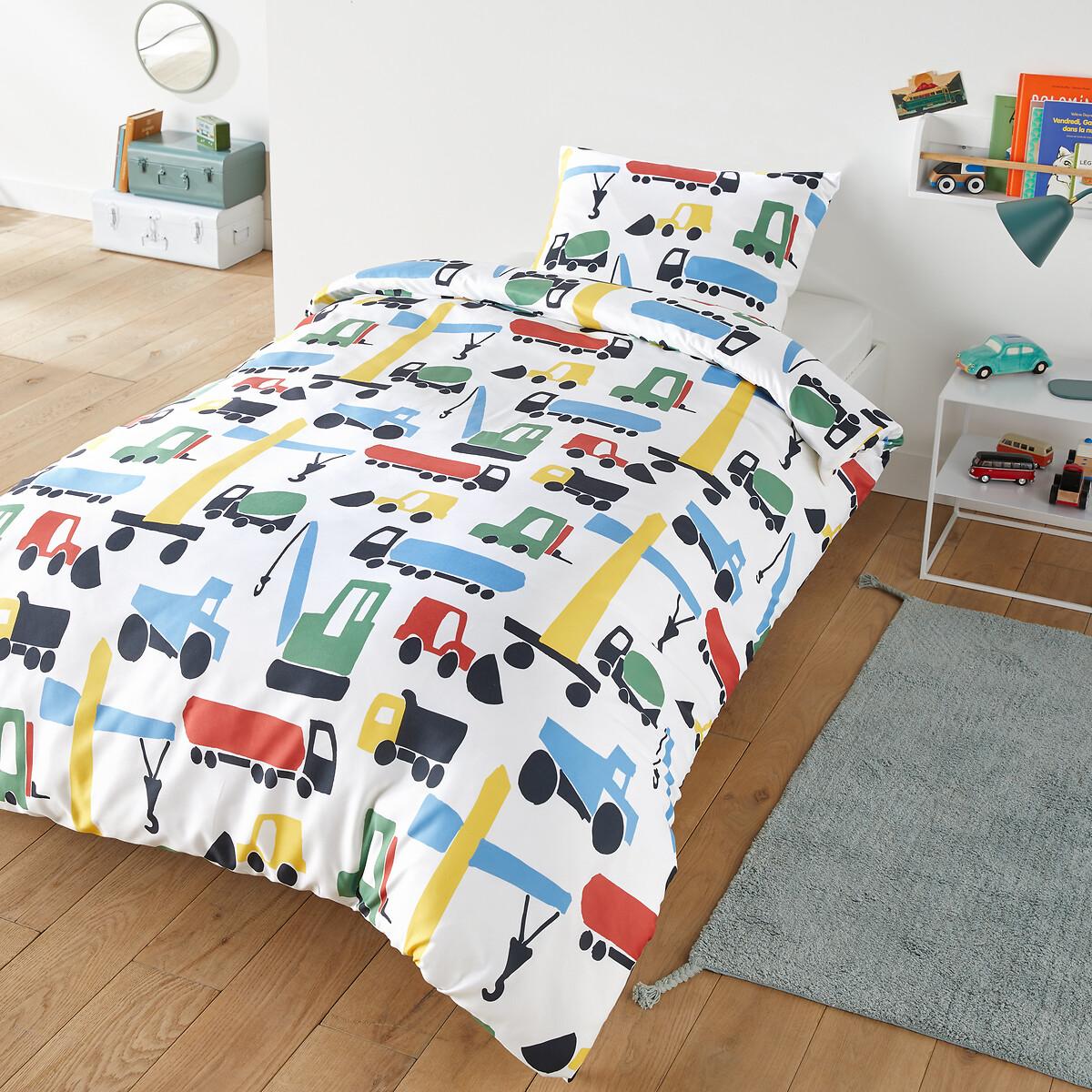 Recycled microfibre bedding set. Vroom Vroom! It's high time your budding builder had an exciting adventure. Recycled polyester microfibre: a light material, soft to the touch and easy to wear. The set includes the duvet cover and its matching rectangular pillowcase. Product Details • 100% polyester • Recycled microfibre • Print front and back • Straight buttoned hem Care Advice • Machine washable at 60°C • By washing your laundry at 40°C instead of 60°C, you limit energy consumption. Dimensions • 140 x 200cm • Recycled polyester. Using recycled polyester is all about conserving resources and reducing waste.