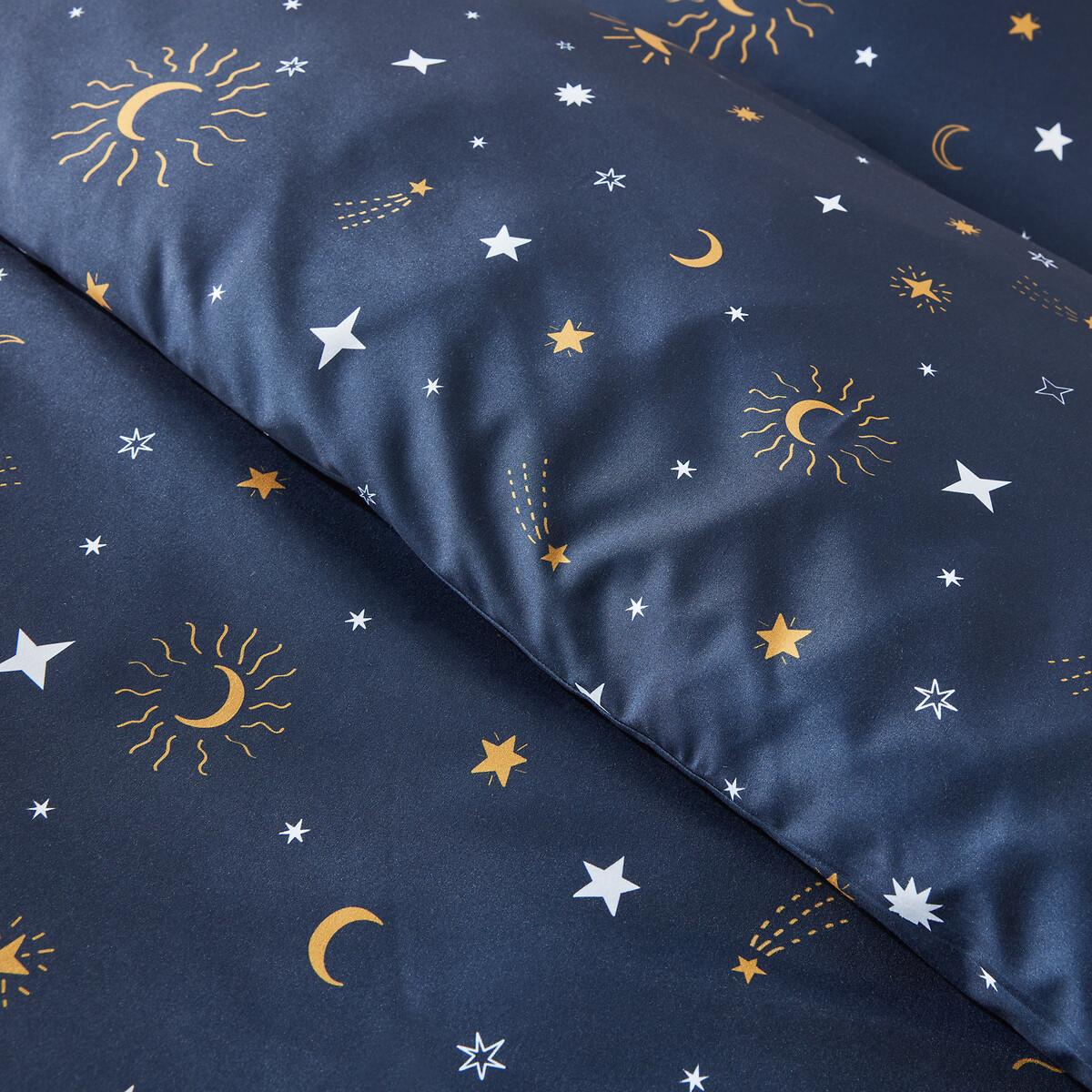Recycled microfibre bedding set. A stars and moons pattern, for sweet dreams. Recycled polyester microfibre: a light, soft-to-the-touch material. The set includes the duvet cover and its matching square pillowcase. Product Details • 100% polyester • Recycled polyester • Microfibre • Double-sided stars and moons print • Straight buttoned base for the duvet cover. Care Advice • Machine washable at 60°C • By washing your laundry at 40°C instead of 60°C, you limit energy consumption. Size • Duvet cover 140 x 200cm + 1 pillowcase 63 x 63cm : Single • Recycled polyester. Using recycled polyester is all about conserving resources and reducing waste.