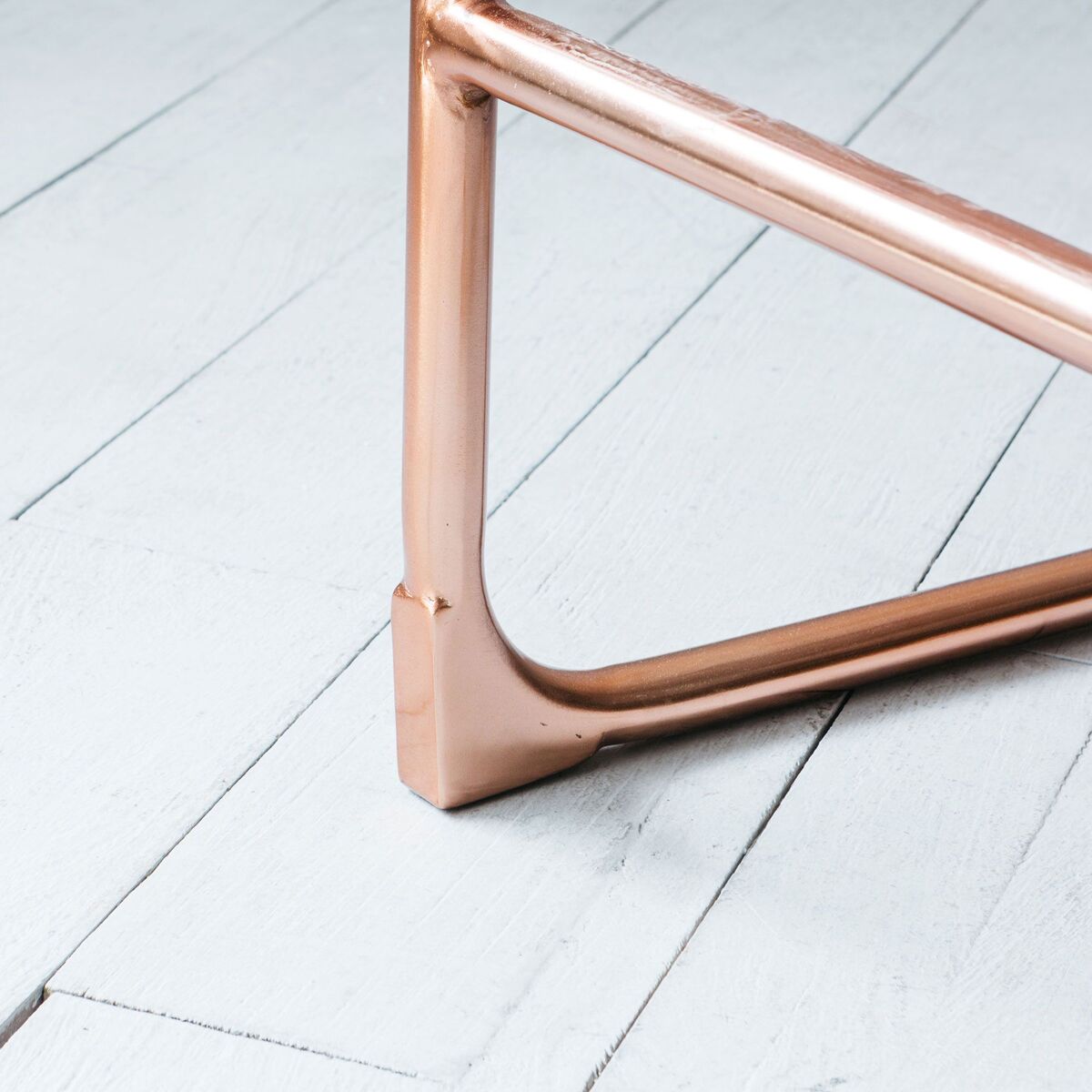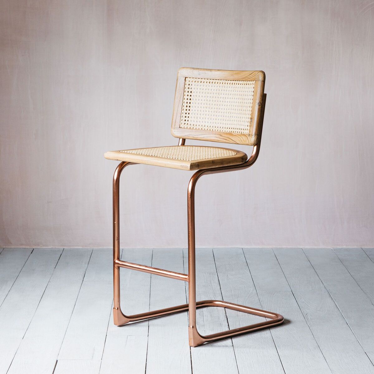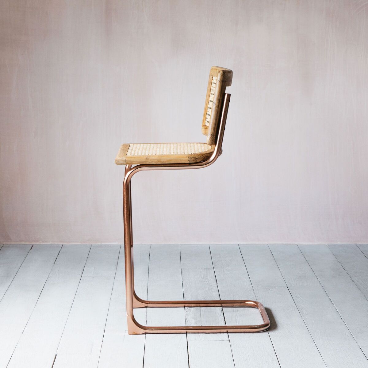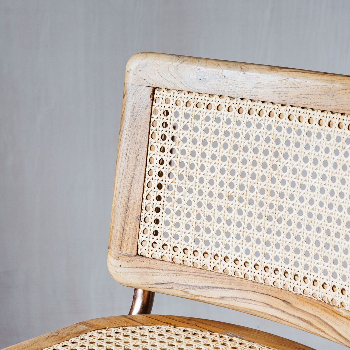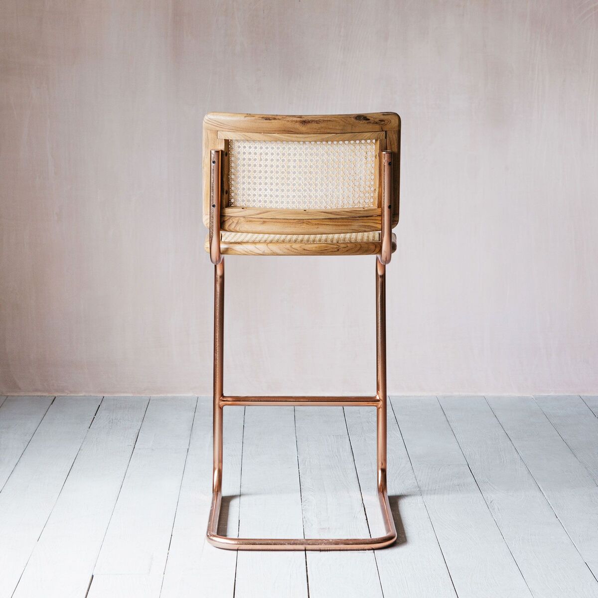 A sleek retro chair with a recycled teak and cane seat and copper finish legs, create a refined seventies dining experience with these chairs. H98 x W40 x D47cm. Made of mango wood, cane and iron with a copper finish. Seat height: 66cm | Seat depth: 47cm. Leg height: 98cm. Clean with a soft dry cloth. Due to the handmade nature, colour and natural pattern may vary.