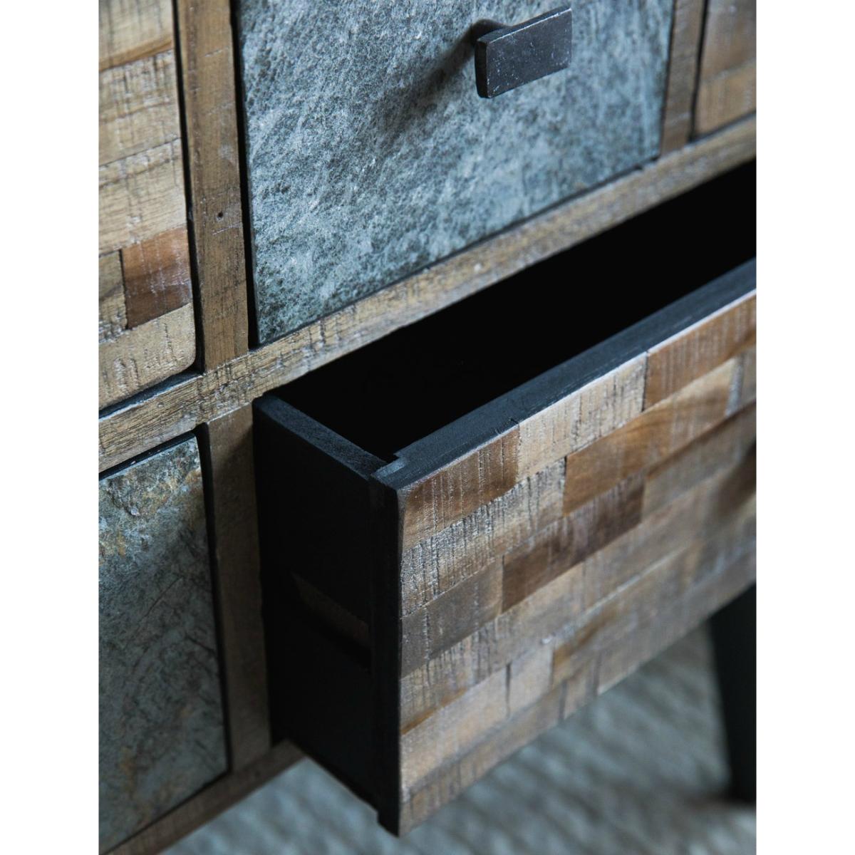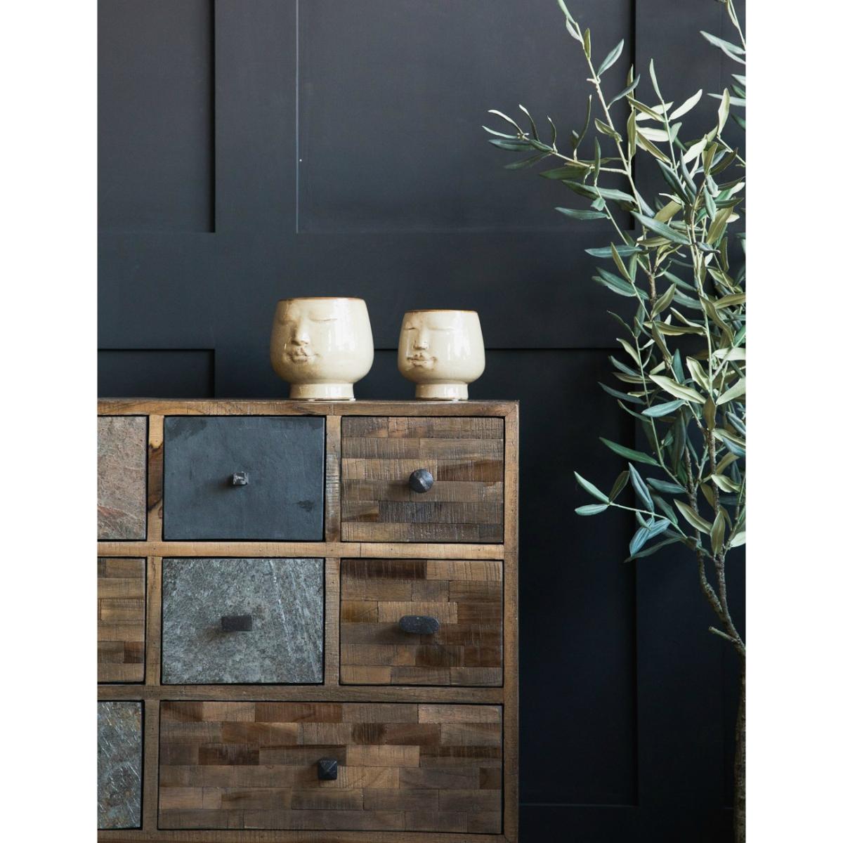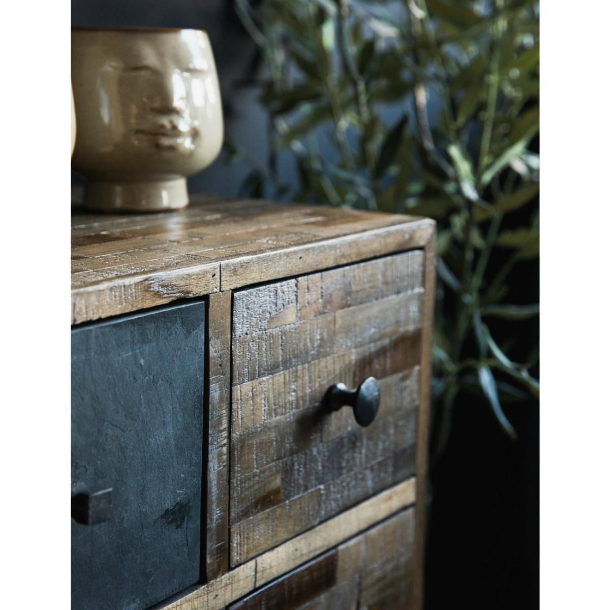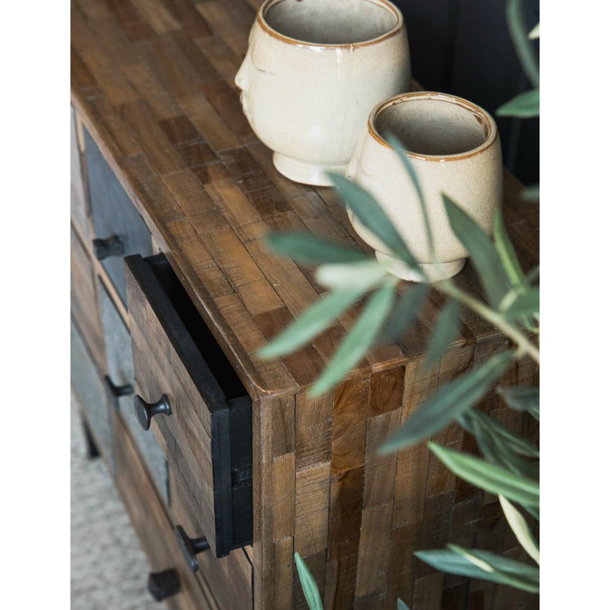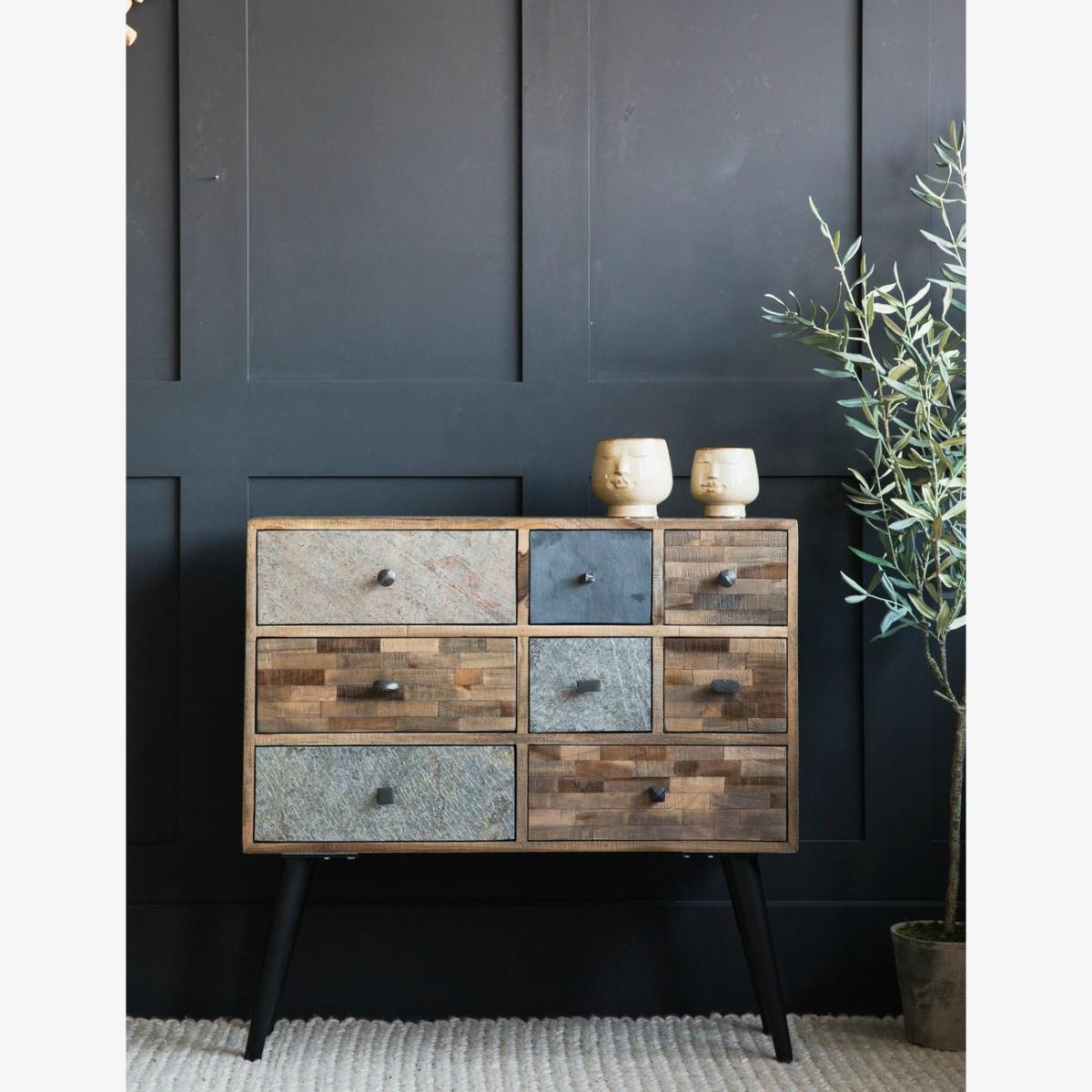 I love the way this repurposed teak side unit adds warmth and texture to a space, making it a versatile statement piece. Its mix of recycled wood tones and colours lends itself well to both contemporary and rustic interiors, especially those with a natural or eco-conscious aesthetic. Practical styling tips include using it as a storage solution in living rooms or hallways, complemented by minimal decorative items on top like candlesticks or small plants to keep the look fresh. It also works well with monochrome palettes, adding visual interest without overwhelming the space. The individual drawers invite organised storage, making it both functional and stylish in a variety of settings.