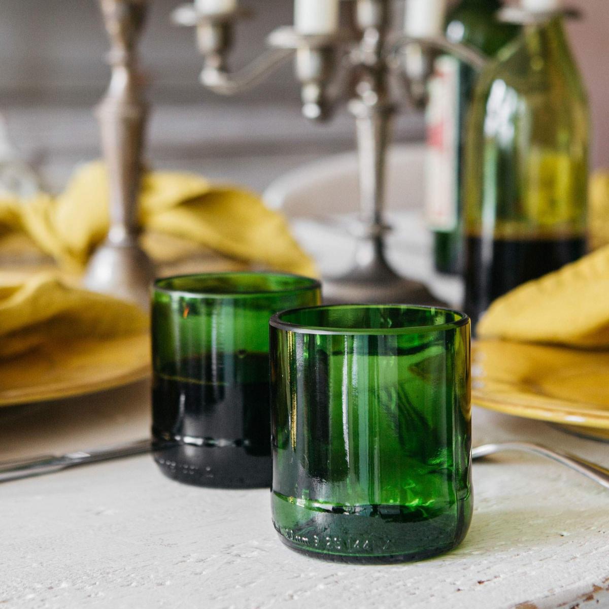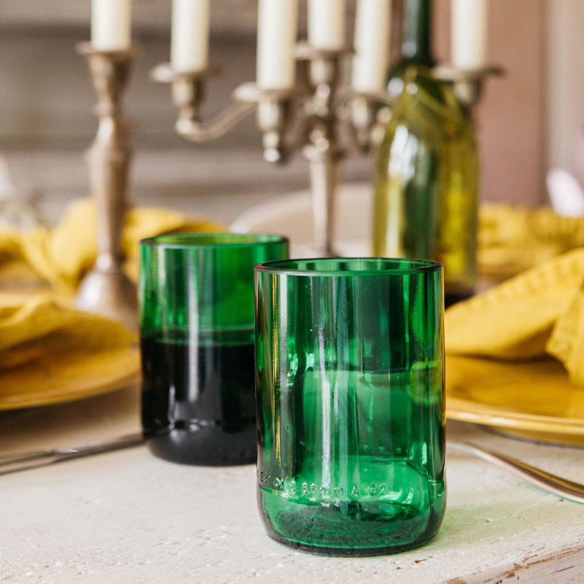 Green glassware, 100% recycled from old wine bottles from Zanzibar, the product of a village youth charity project. No two are alike, expect slight variations in size and colour. Set of Two Small Bottle Glasses (OZU1003): H8 x Diameter 7cm. Set of Two Medium Bottle Glasses (OZU1002): H11 x Diameter 7cm. Wine Bottle Carafe (OZU1001): H18 x Diameter 7cm. Wine Bottle Vase (OZU1000): H24 x Diameter 7cm. Made of upcycled bottles. Ethically sourced from a small village in Zanzibar. Due to the handmade nature of this product size and colour may vary.