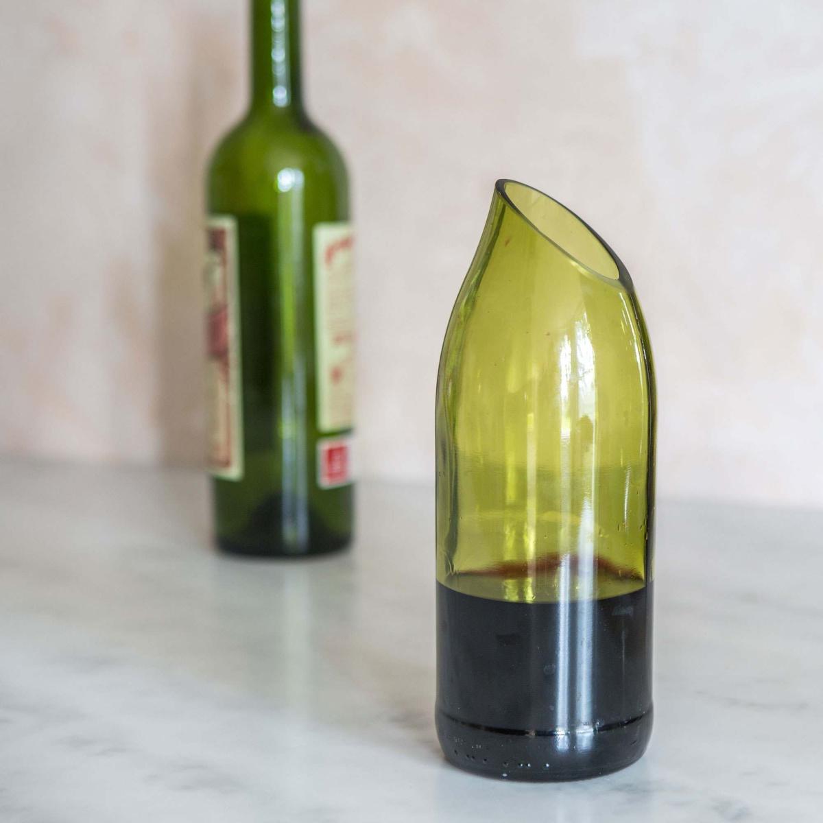 I love this recycled wine bottle vase for its eco-friendly approach and effortless charm. Its minimalist design makes it versatile across a range of interiors, from modern and industrial spaces to more rustic and eclectic setups. It works particularly well for creating simple floral displays or as a standalone piece on a shelf or side table. For styling tips, consider grouping a few in different sizes on a tray or placing single stems with bold foliage inside for a clean, contemporary look. This piece adds a touch of sustainability and understated elegance that can easily complement existing decor without overpowering it.