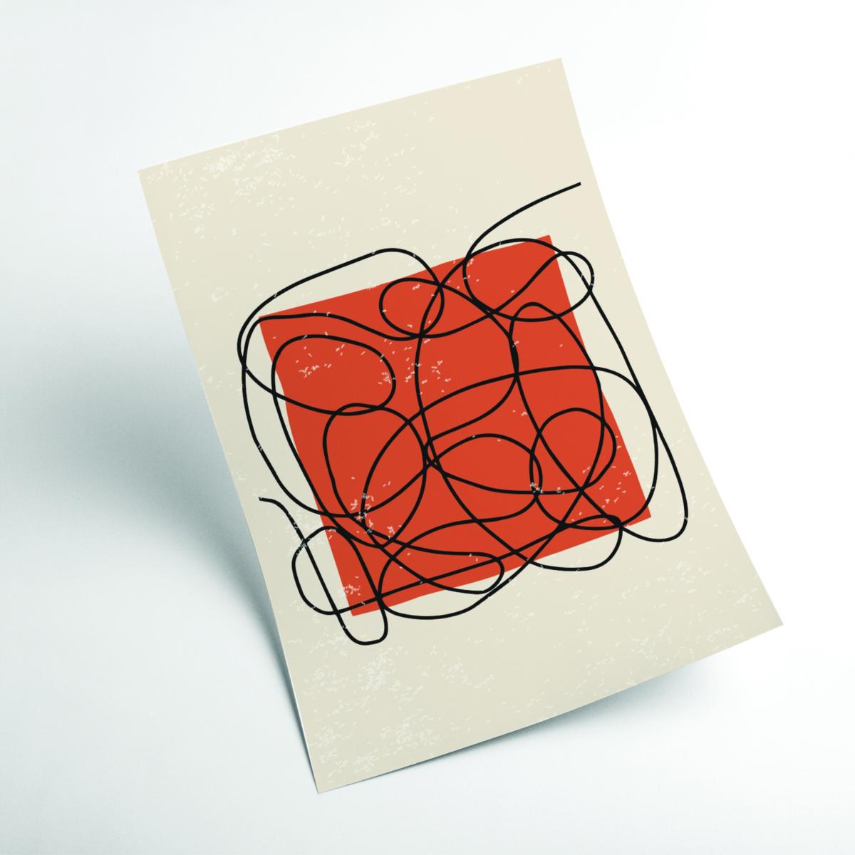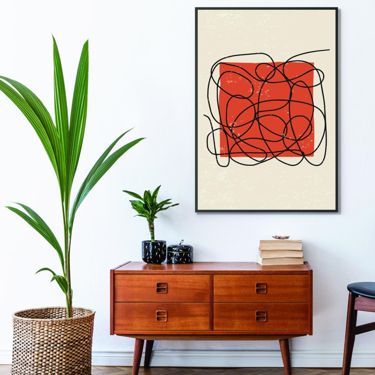 I love this piece because of its bold, abstract design and striking colour combination, making it an excellent statement piece. It works particularly well in contemporary or minimalist interiors where its vibrant reds and dynamic lines can add energy and visual interest without overwhelming the space. For styling, consider pairing it with neutral or monochrome surroundings to really let the artwork stand out, or place it above a simple console or sofa to create a focal point. Practical tips include framing it with a sleek, understated frame to keep the look modern, and balancing it with other subtle accessories to avoid visual clutter. Overall, a versatile piece that can inject colour and personality into various living or workspace environments.