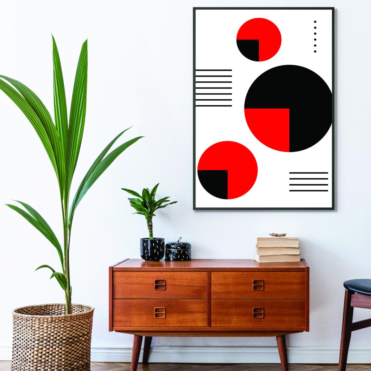 This print is a stylish example of modern geometric artwork, perfect for adding a bold yet minimalist statement to contemporary interiors. I love how it combines simple shapes and a tight colour palette of red, black, and white, making it versatile for various schemes. It works particularly well in neutral or monochrome spaces, but can also add a striking contrast in more colourful environments. For styling tips, consider hanging it above a plain sofa or a sleek sideboard to create a focal point, or group it with other abstract pieces for an eclectic look. Its sizeable A2 format ensures it commands attention, making it ideal for feature walls in living rooms, home offices, or even minimalist lobbies.