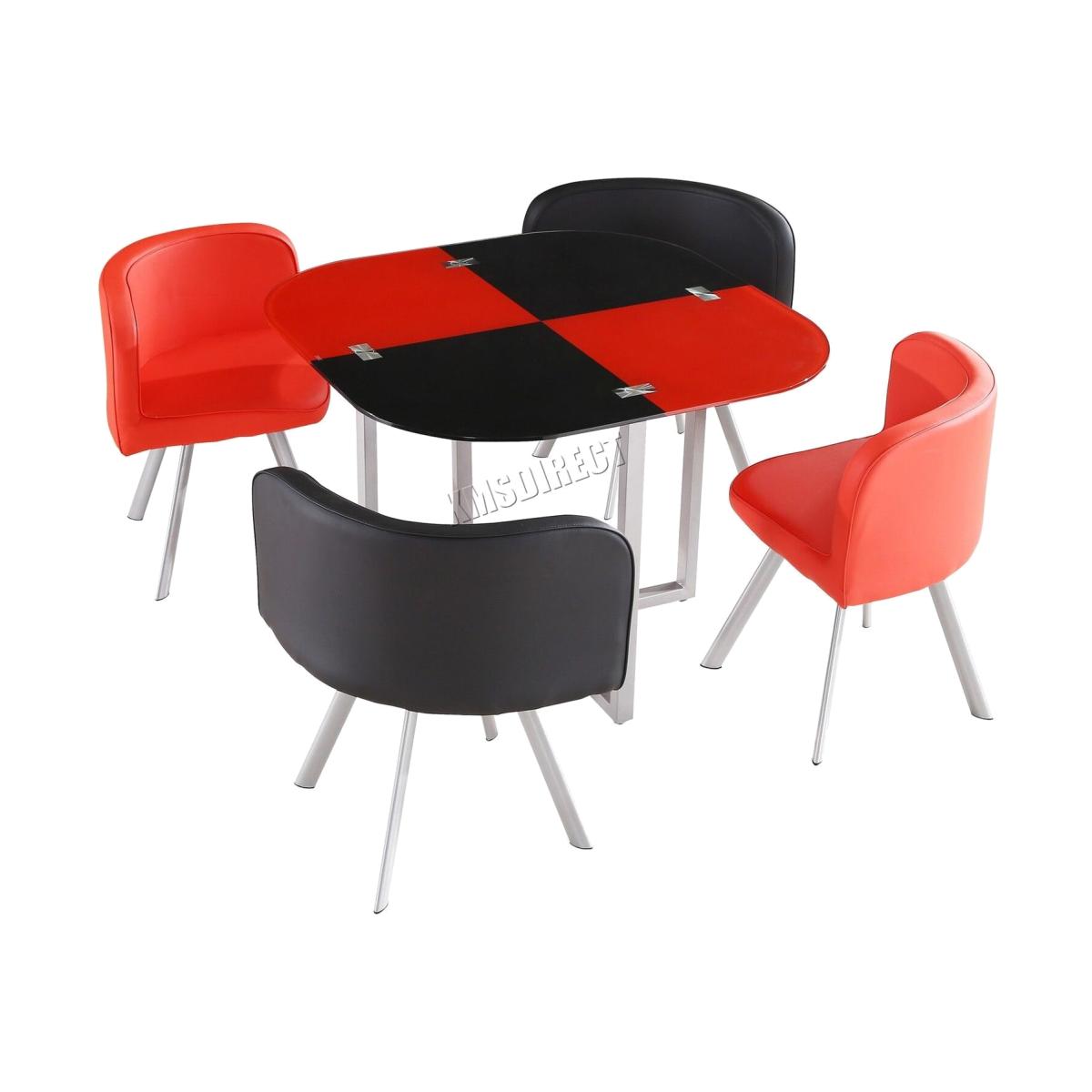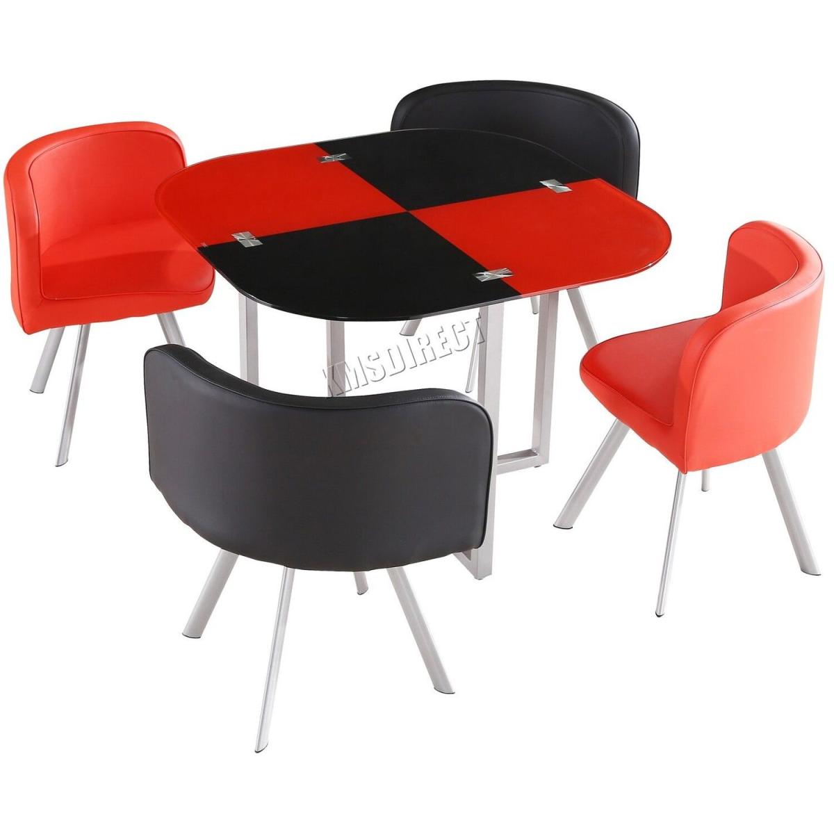 A beautifully designed set, combining 2 contrasts of colour into one dining table! spacer saver glass table and four faux leather cushioned comfort chairs. A stunning round glass red/black colour dining table set with 4 gorgeous faux leather chairs. A wonderful space-saving design that looks lovely too. Available in a choice of colour variations, to suit your dazzling colour theme & room.
